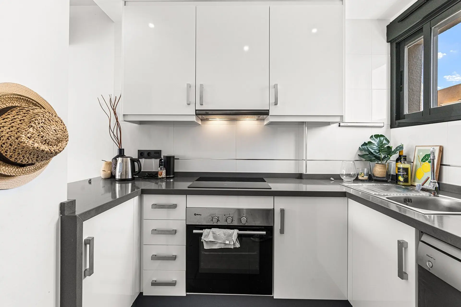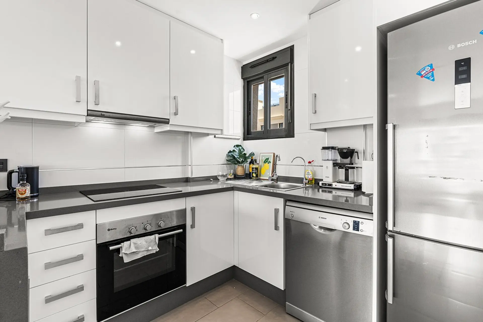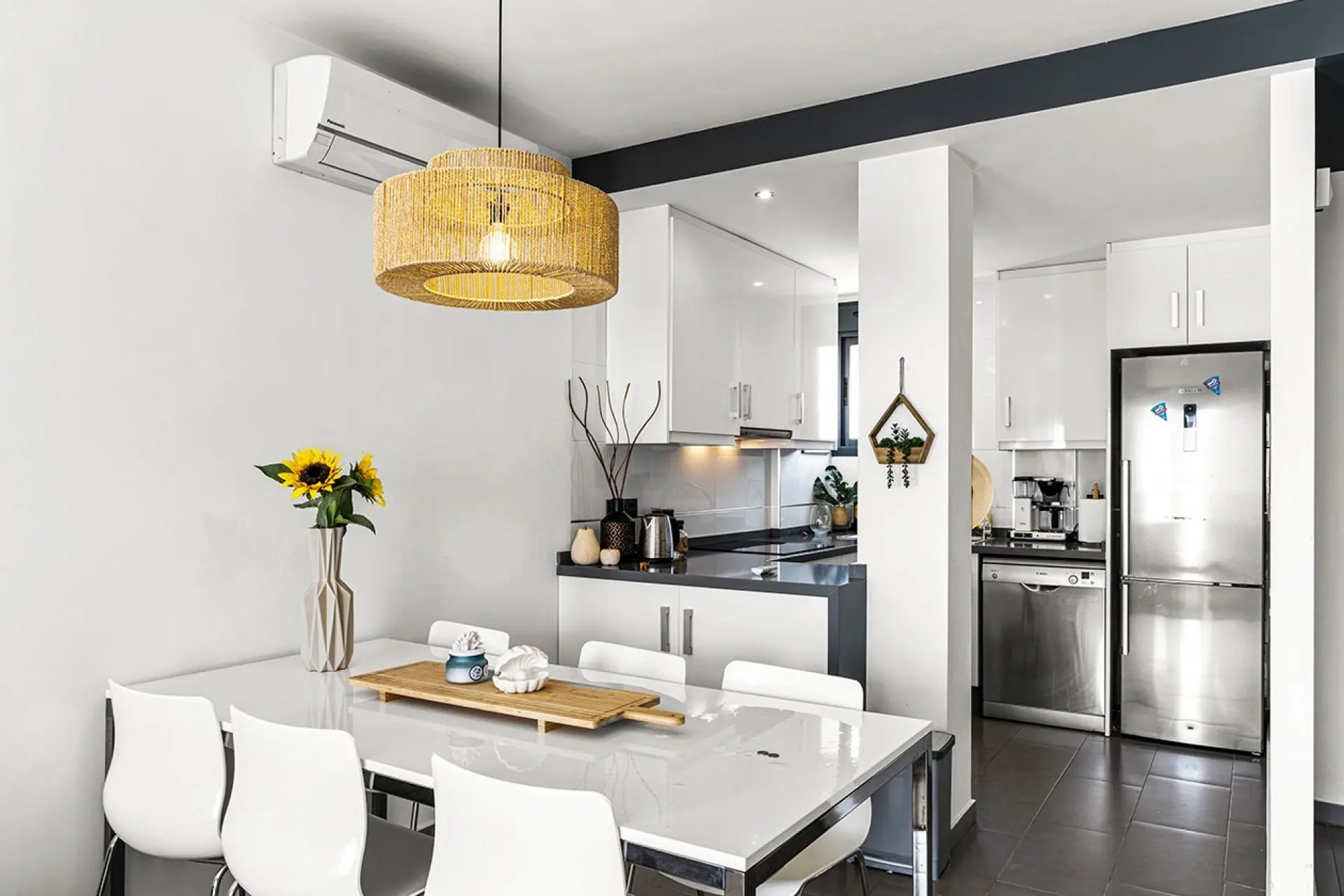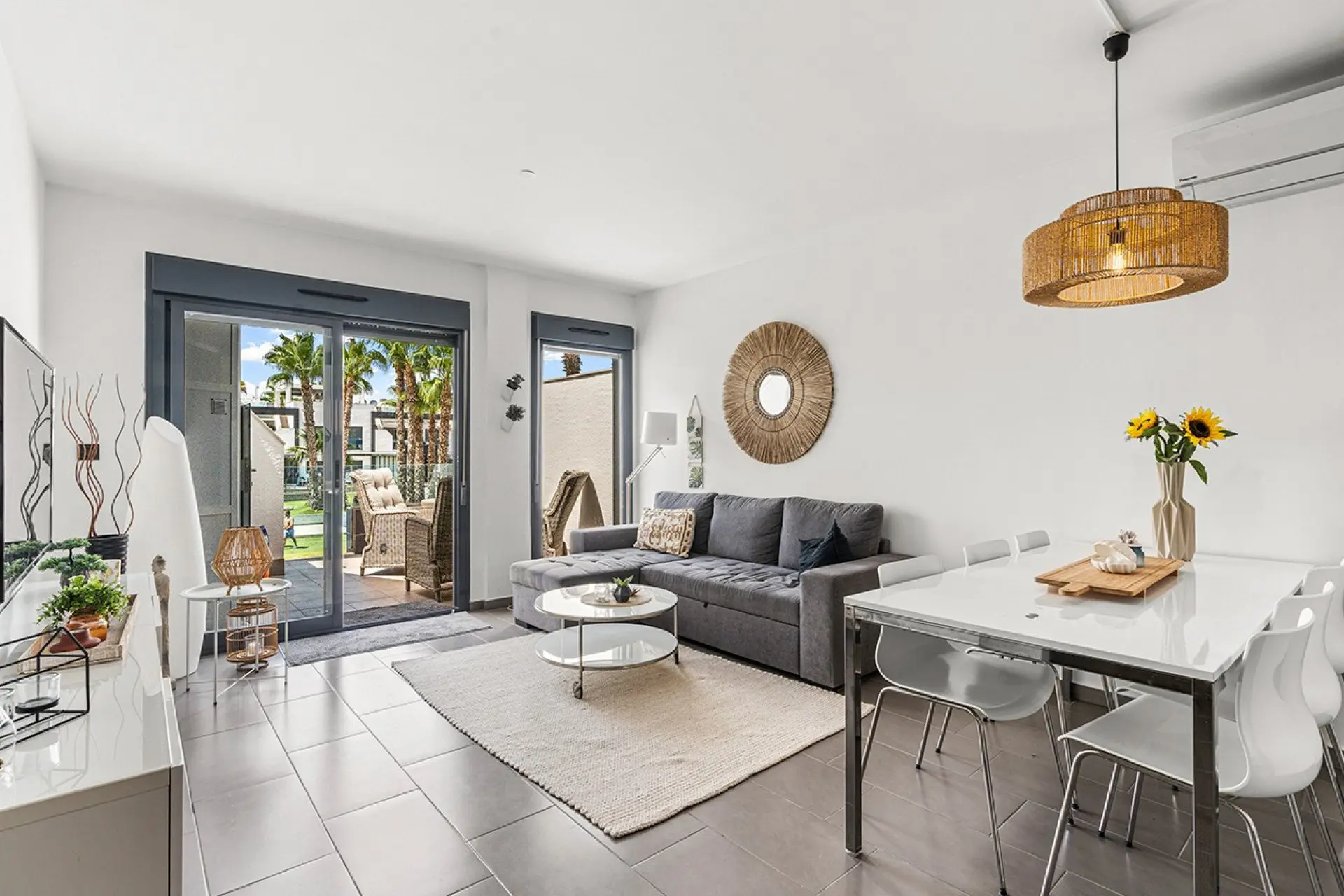 The open-plan kitchen integrates smoothly with the living-dining area, creating an area that feels connected. From the living space, residents can access a private terrace equipped with an awning, suitable for outdoor relaxation.