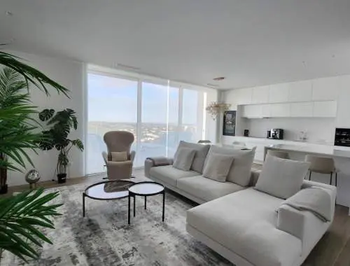 This penthouse features three furnished bedrooms, making it suitable for various living arrangements. One of these bedrooms has its own private bathroom, while the other two are designed for comfort and privacy. The use of light colors throughout the property contributes to a welcoming atmosphere. The airy living room integrates an open kitchen and includes a dedicated bar corner.