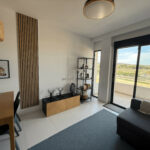 The living area includes a bright, open layout that connects seamlessly to a fully equipped kitchen and an adjoining storage room. This storage room houses the washing machine and boiler, ensuring practical utility. Large sliding doors lead to a south-facing terrace, allowing for unobstructed views. Additionally, glass curtains on the terrace create a versatile space, making it usable throughout the year. Whether you’re enjoying the fresh air or seeking shelter from the elements, this arrangement provides flexibility.