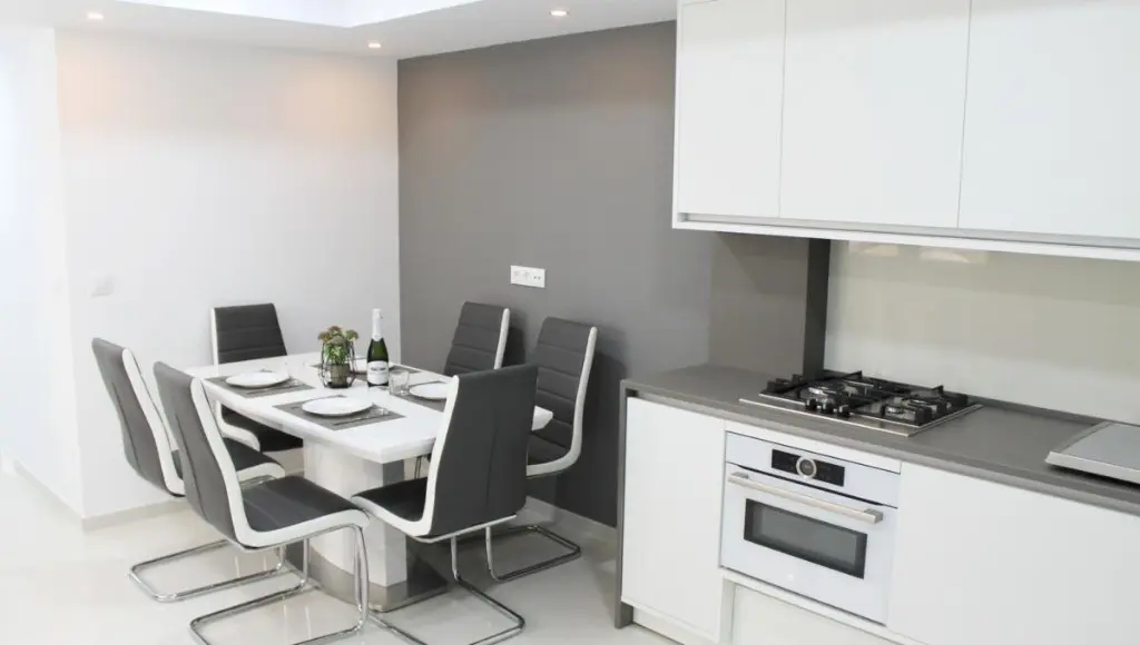 The apartment features three bedrooms, providing ample room for residents or visitors. It includes two bathrooms, which adds convenience for a family or guests. A large lounge area serves as the central space of the apartment, ideal for gatherings or relaxing after a day out. The open modern kitchen, equipped with a dining area, makes meal preparations straightforward and social.