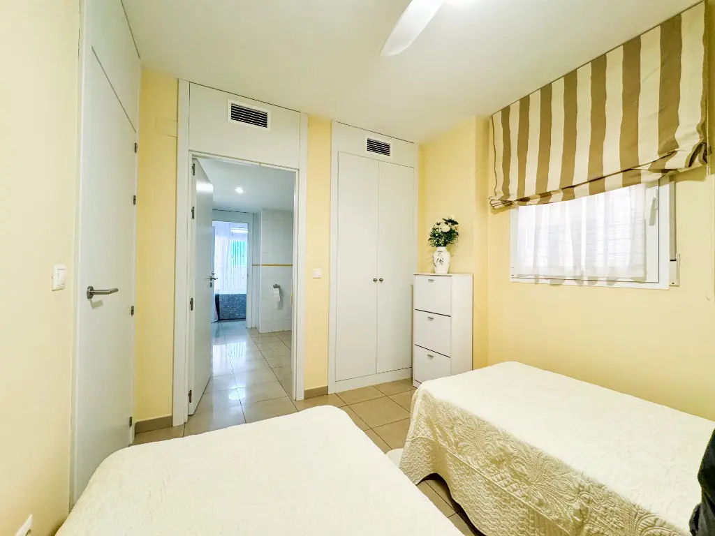 This apartment consists of two bedrooms, both equipped with built-in wardrobes, which provide an efficient use of space. The bathroom features a walk-in shower, making it accessible and easy to maintain. The living-dining area is designed with an open layout, merging seamlessly with a fully equipped kitchen that includes essential appliances.