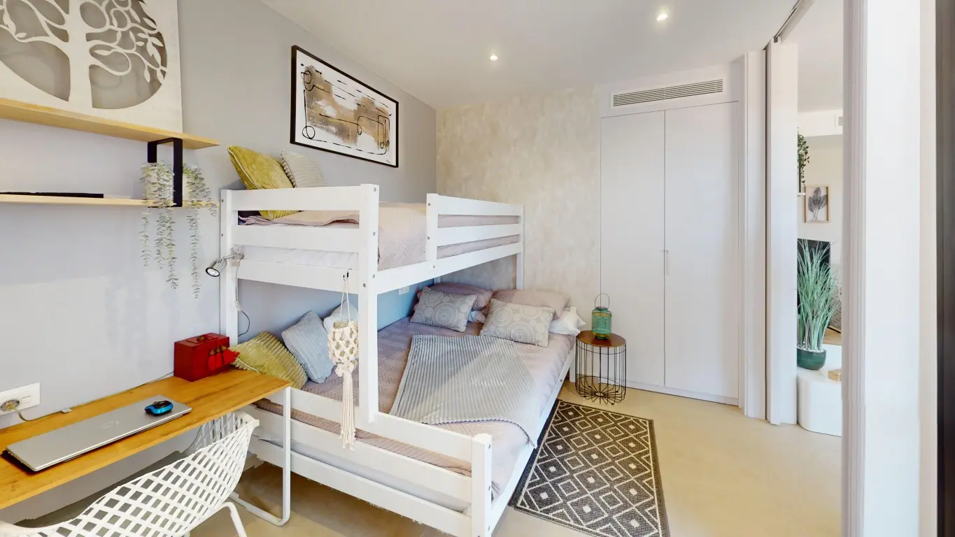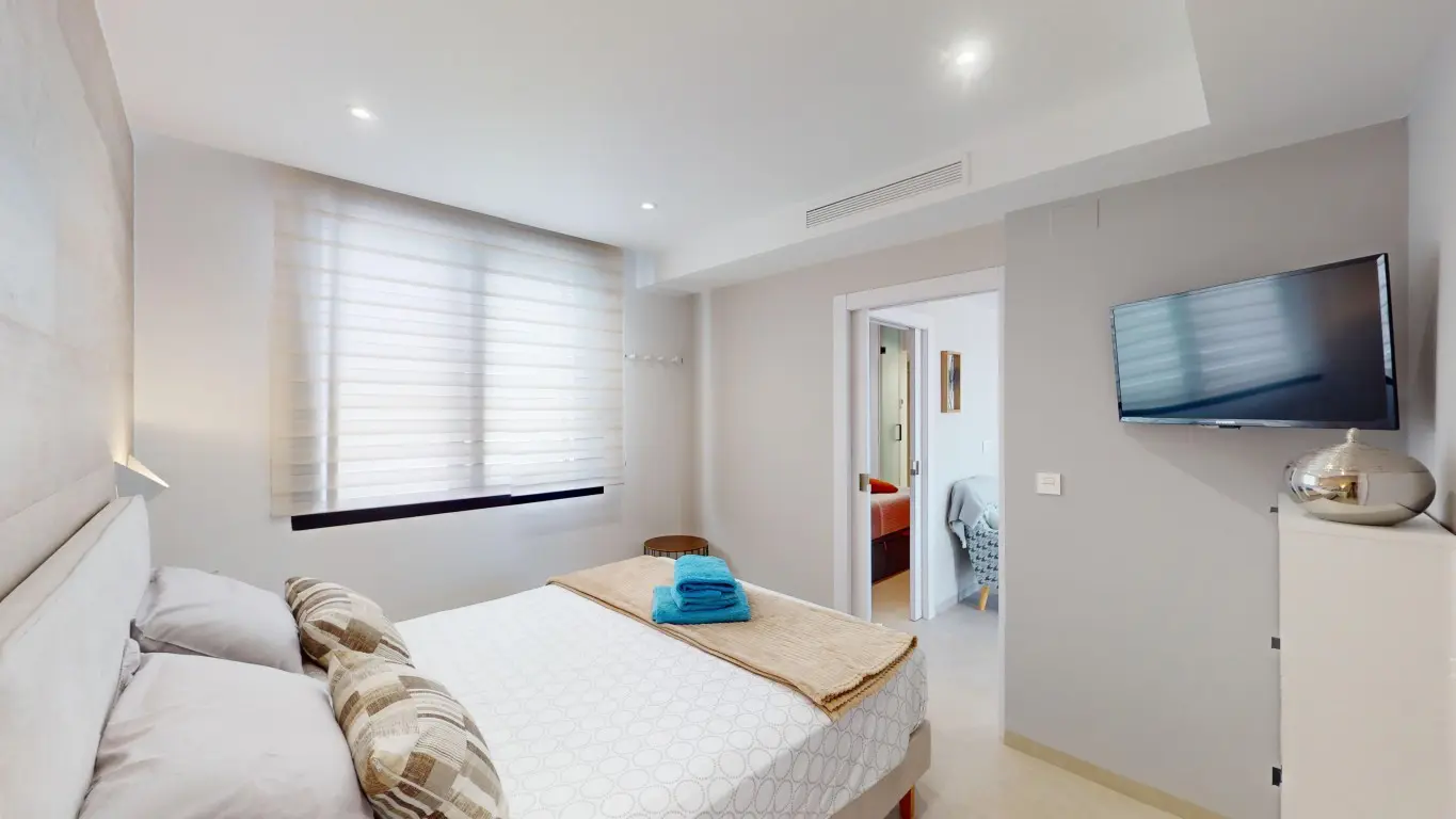 This penthouse offers three bedrooms that can accommodate up to seven people, making it suitable for rental opportunities. There are also two modern bathrooms equipped with underfloor heating, a walk-in shower, and high-quality fixtures. Each bedroom comes with built-in wardrobes, TV connections, and shutters, providing added comfort and privacy.