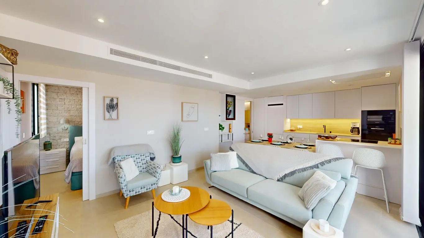 The kitchen features a distinct design, moving away from the standard layouts seen in the complex. Here, you’ll find a kitchen island that doubles as a dining table. High-quality appliances such as a dishwasher, hob, refrigerator, oven, microwave, and extractor hood are included. Custom-made cabinets provide ample storage space, making this kitchen both functional and attractive. The entire apartment is fully air-conditioned, covering both the living area and bedrooms.