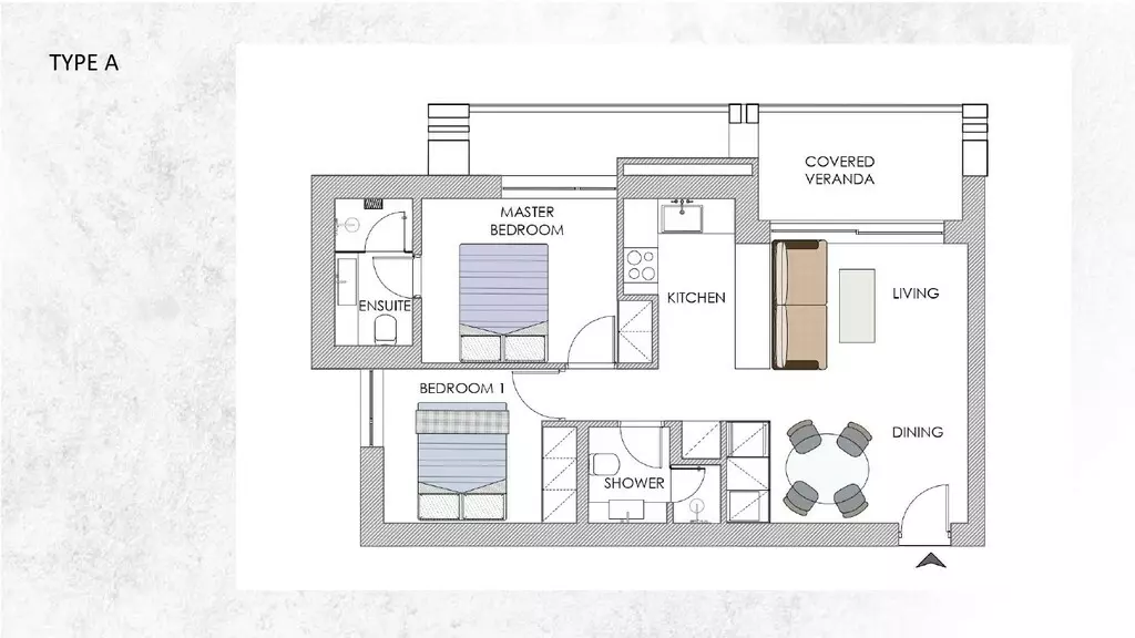 The apartment features two bedrooms, providing ample space for residents or guests. The living room is connected to the kitchen, creating an open concept area that facilitates interaction and movement. Additionally, there are two shower WCs, offering privacy and convenience.
