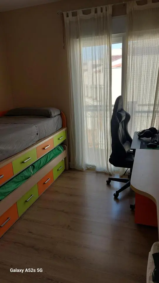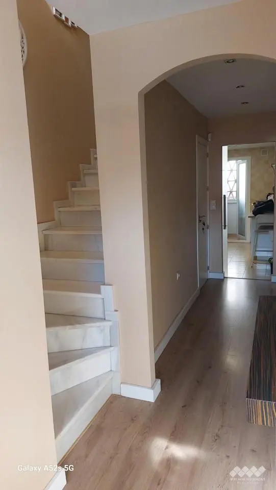 On the first floor, you will find three bedrooms, each equipped with built-in wardrobes and private terraces that add a personal outdoor space to each room. The property includes two full bathrooms, one featuring a shower and the other an en-suite with a bathtub, facilitating a variety of family needs.