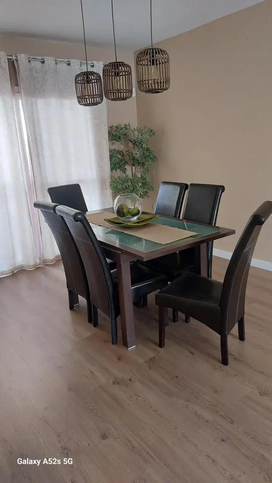 The kitchen in this home is designed for practicality, equipped with a separate laundry area. There is also a small bathroom located on the ground floor, adding to the property’s functional layout. The overall flow from the kitchen to the dining area allows for easy movement and interaction.