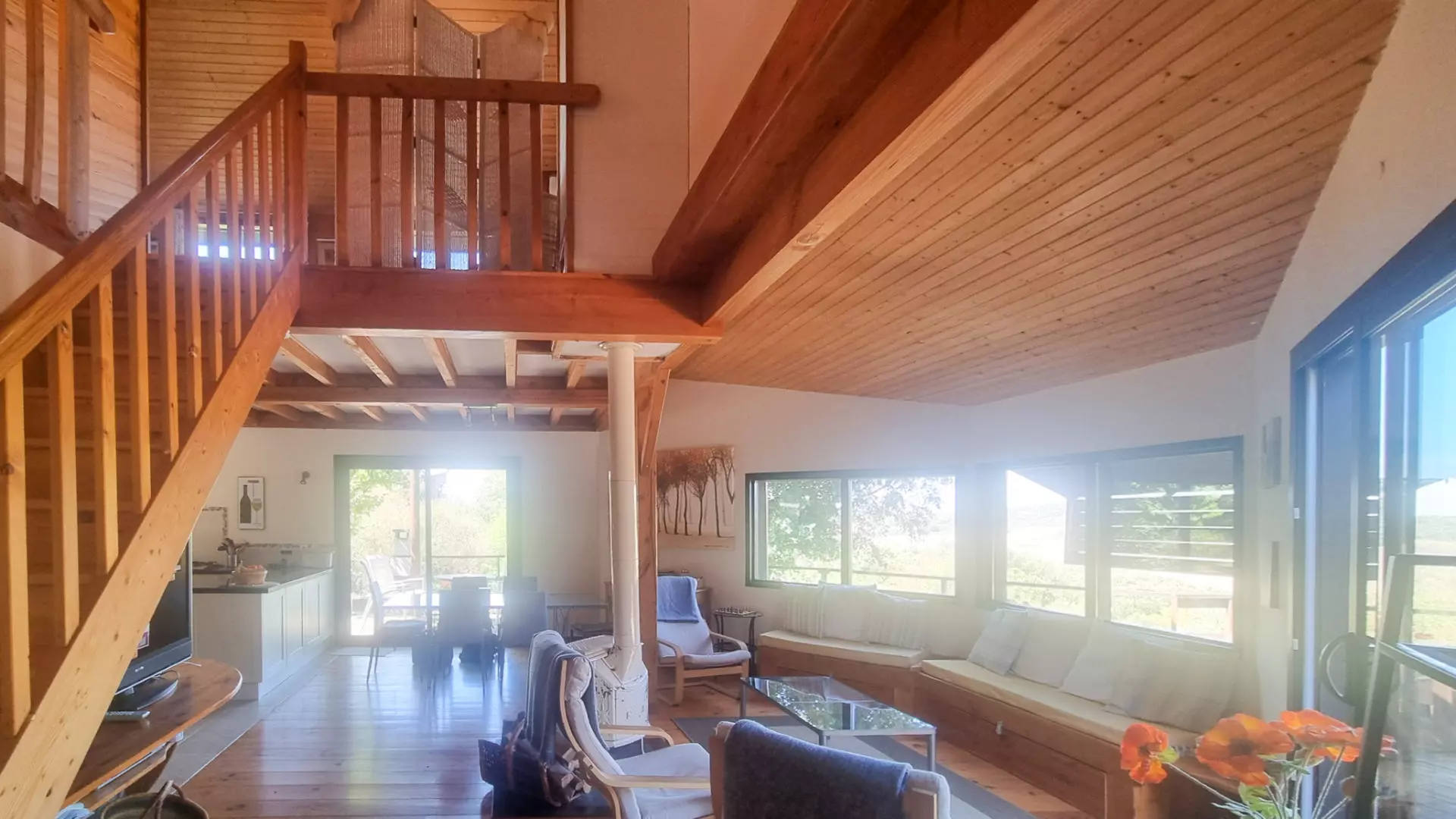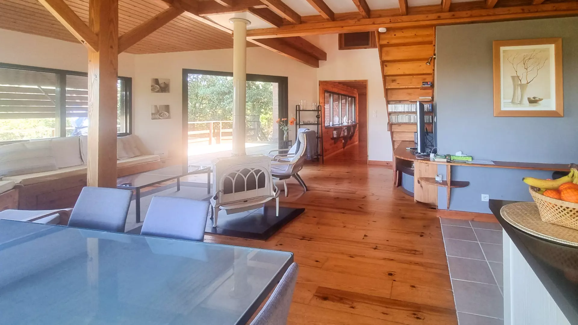 The ground floor features an open-plan living room, filled with natural light. It is equipped with a woodburner and glazed doors that lead out to a wraparound deck, providing easy access to outdoor spaces.