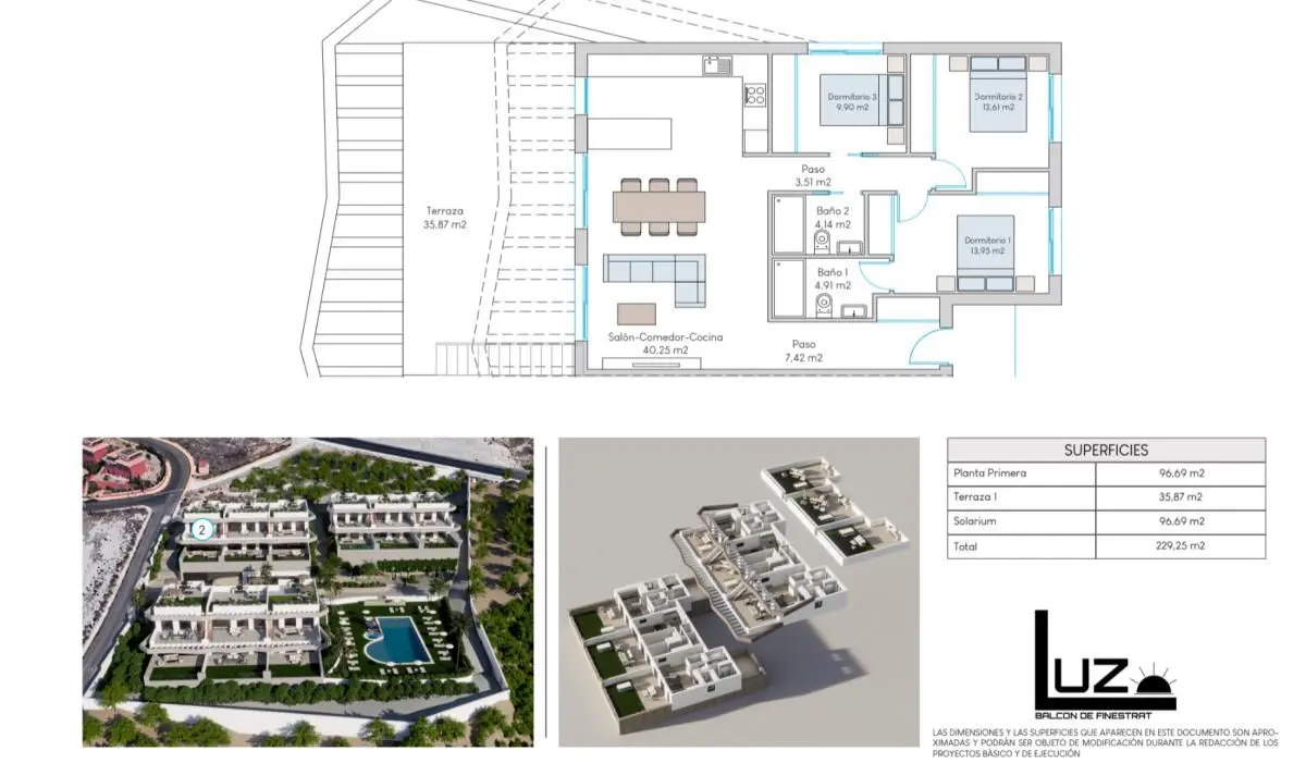 The homes offer generous terrace sizes, ranging from 35.87 m2 up to 100 m2. Residences on the upper floors are complemented by solariums that are at least 90 m2. These outdoor areas are designed to take full advantage of the local climate, with over 330 days of sunshine per year, making them suitable for enjoying the environment of Finestrat on the Costa Blanca.