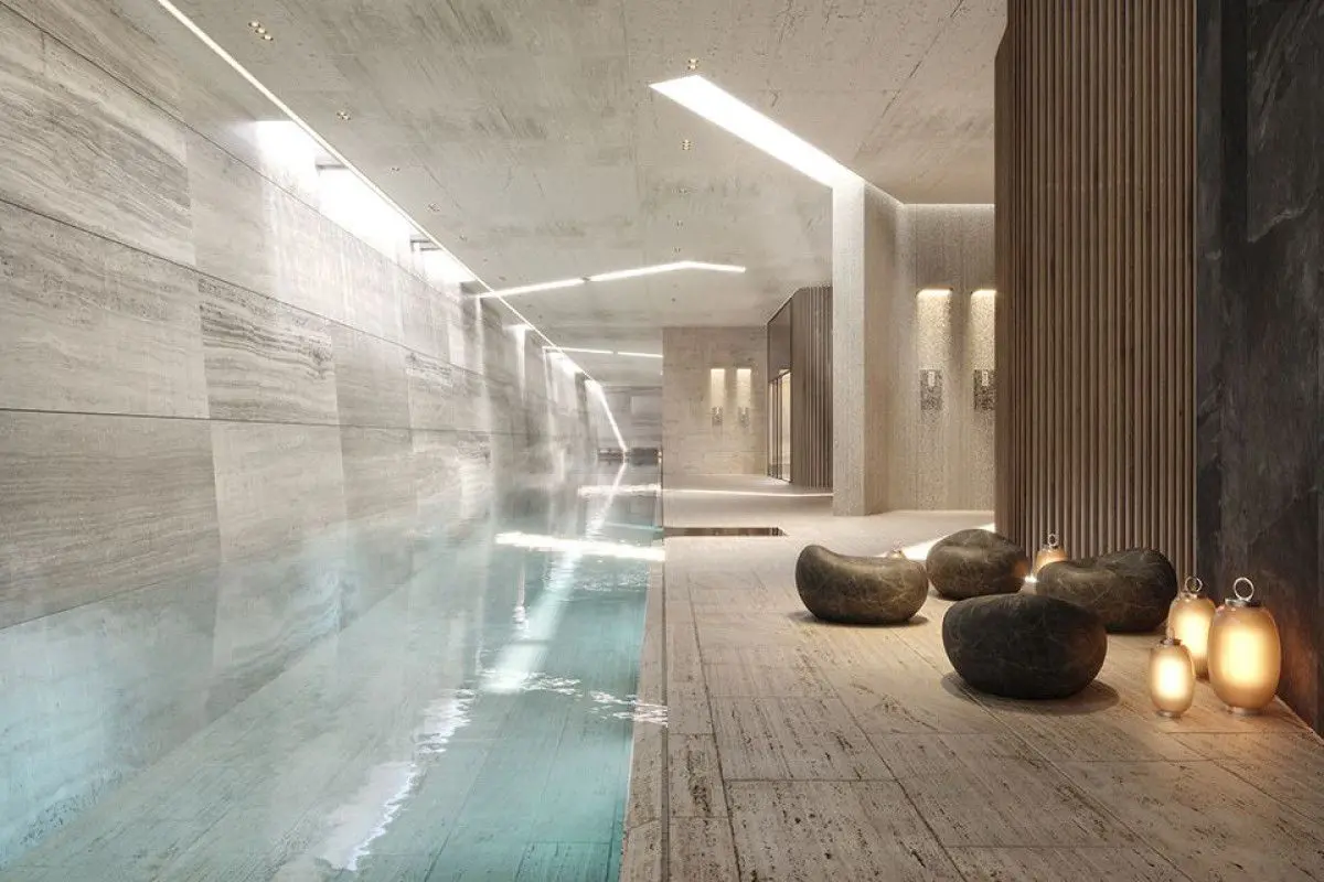 Up at the highest point of the whole project, there’s a really innovative Social Club. This place is packed with amenities. You can head to the full spa, get a workout in at either the indoor or outdoor gym, or even get some work done in the coworking area. For a serious swim, there’s an indoor pool that’s almost Olympic-sized. What’s particularly special is the infinity pool here; it’s suspended over 8 meters off the ground and offers stunning, sweeping views of both the sea and the mountains. It’s definitely the kind of place that creates memorable moments.