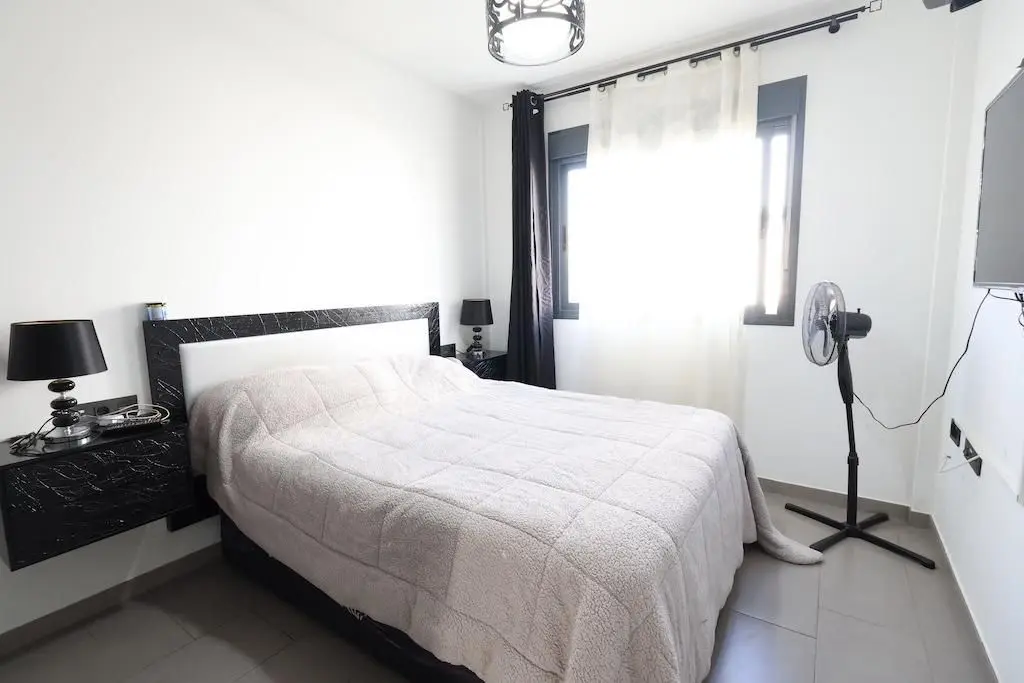 Ground-floor bungalow with two gardens: one measuring 13 m2 with direct access to the communal swimming pool area, and another of 6 m2 at the back of the property. The home offers 77 m2 distributed into 2 bedrooms, 2 bathrooms, an open-plan kitchen connected to the living-dining area, and a glazed terrace. It is sold fully furnished and equipped with air conditioning. An outdoor parking space is included. The residential complex features large green areas, a children’s play area, and is located next to the Zenia Boulevard shopping centre.