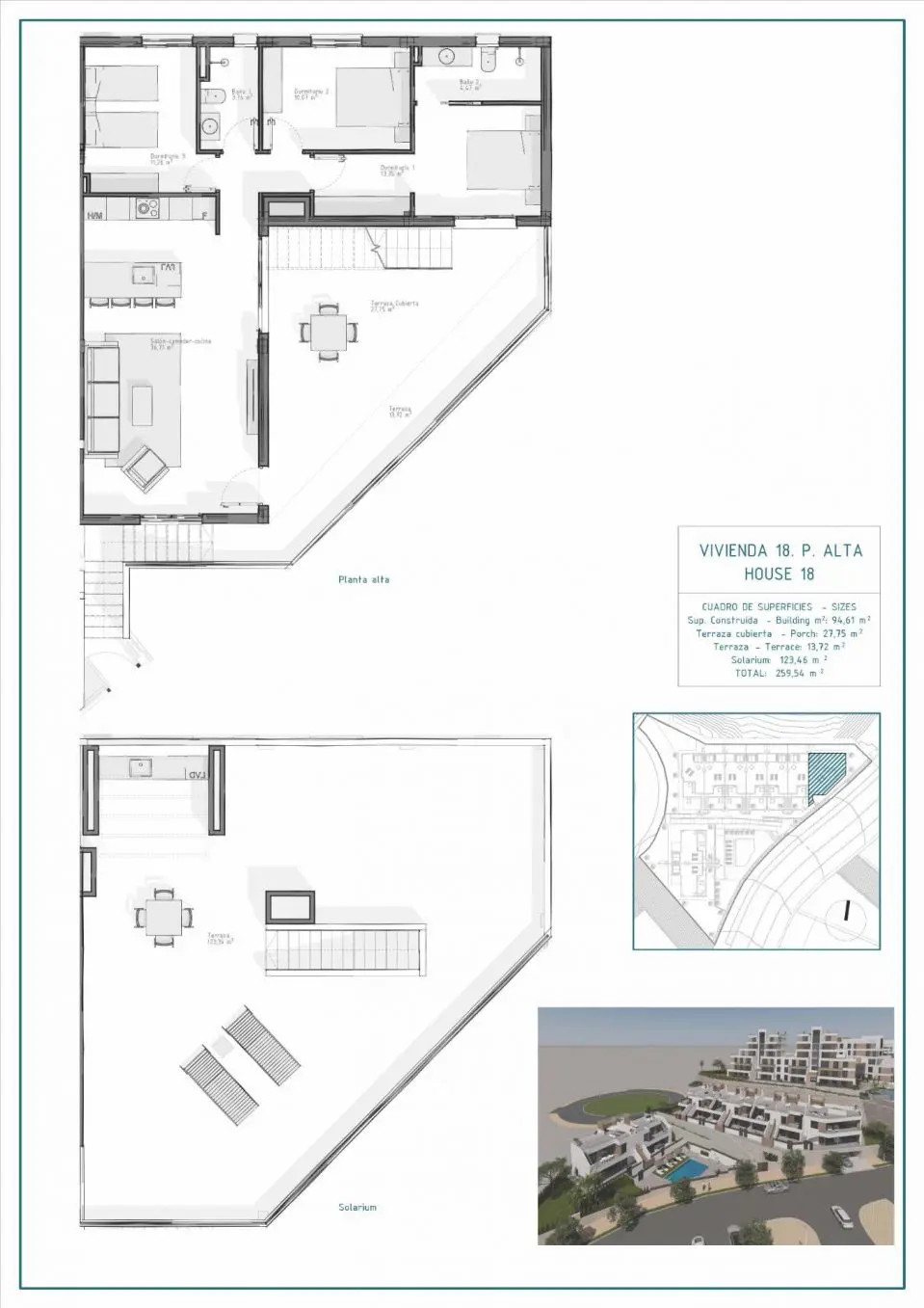 Upper floors with large solariums including summer kitchen and pergola with solar panels.