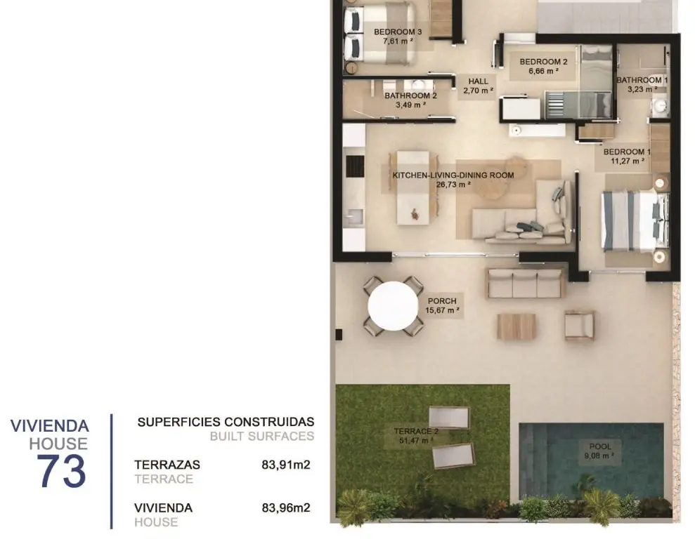 Let’s talk about the properties. Each bungalow apartment boasts 2 or 3 spacious bedrooms, along with 2 pristine bathrooms that provide comfort and convenience. The open plan kitchen seamlessly flows into the lounge area, creating a warm and inviting atmosphere. Picture yourself enjoying morning coffee on your terrace while soaking up the sun!