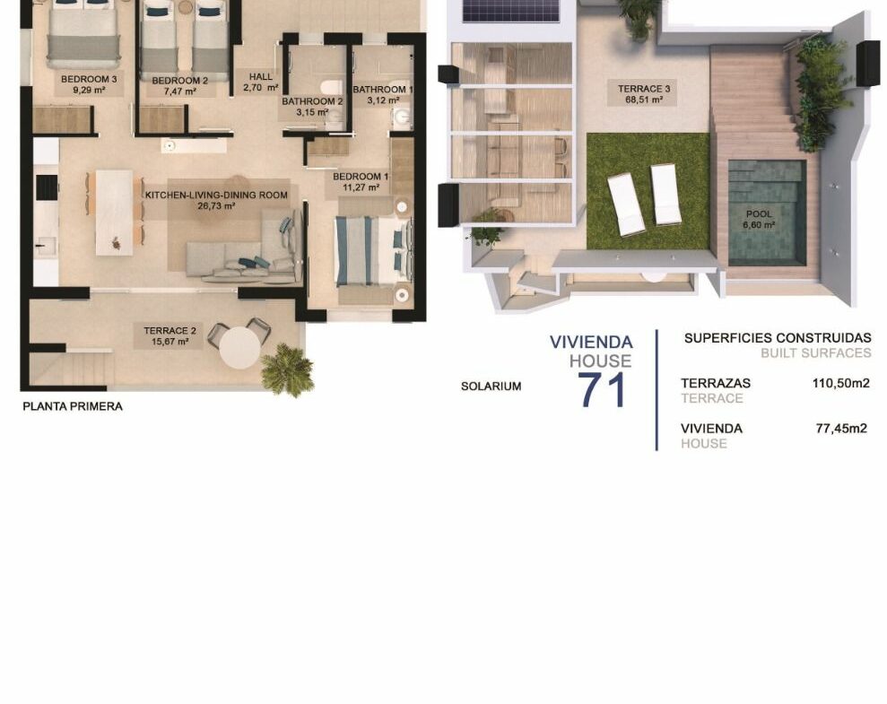 Each property in this complex includes three bedrooms and two bathrooms. The design incorporates an open-plan kitchen that flows into the lounge area. Fitted wardrobes contribute to the practical layout of the units, and each apartment also has a terrace for outdoor relaxation.