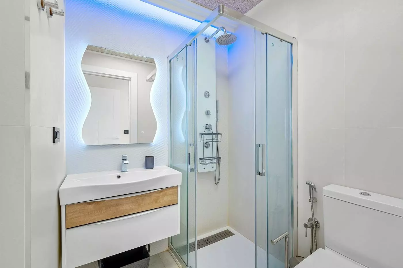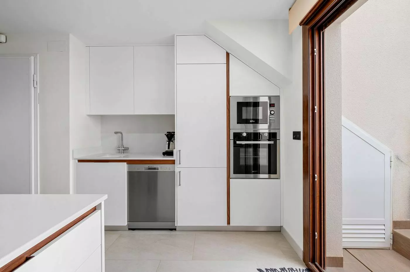 The penthouse includes two well-lit bedrooms, complete with built-in wardrobes. This setup provides ample storage for your essentials. The two bathrooms feature modern designs with walk-in showers, making them both stylish and practical. An open-plan format integrates the kitchen and living area, creating a bright space ideal for entertaining or relaxing. This area grants direct access to a terrace that overlooks a well-maintained communal garden and pool area.