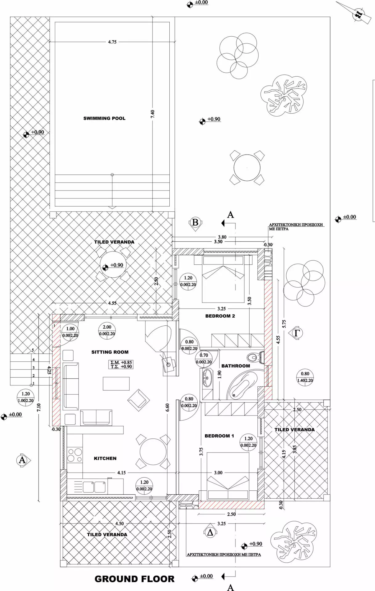 From the living room, large sliding glass doors open onto the shaded outdoor seating area, the swimming pool (4.35m × 7m), and the poolside terrace.