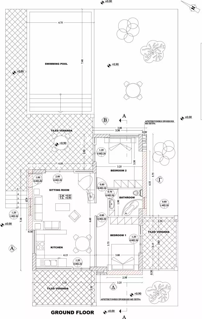 • an open kitchen, dining & living room with fireplace, which has access to the pool terrace in front of the house and a covered veranda behind the house,