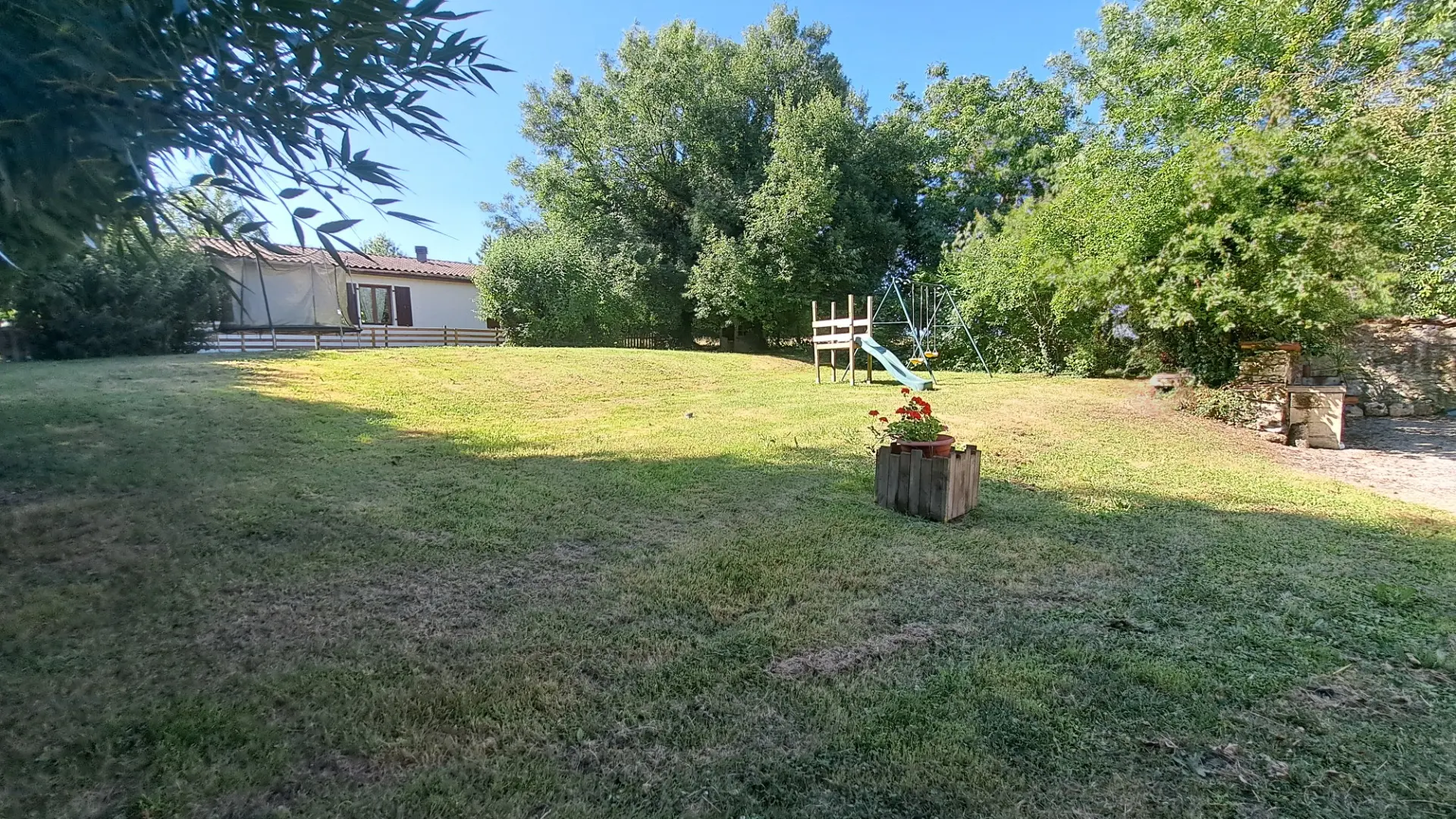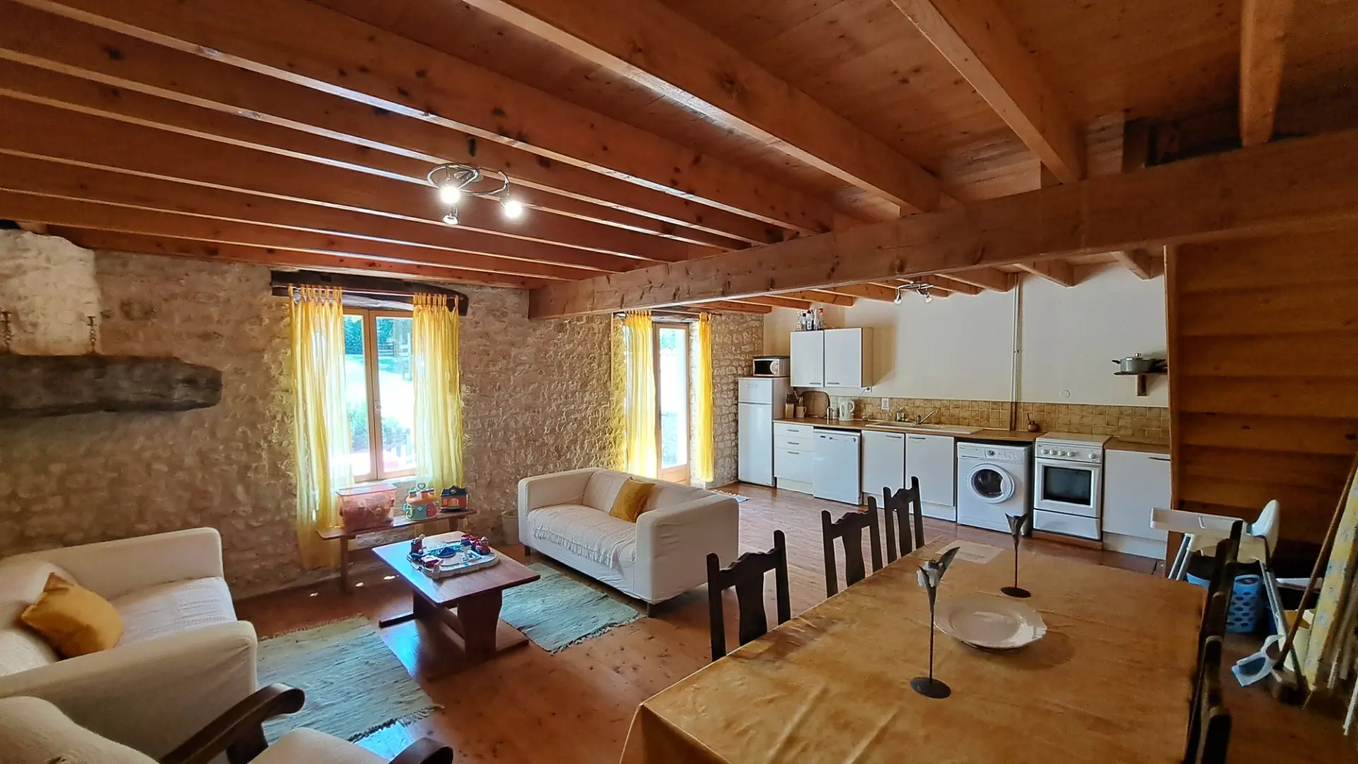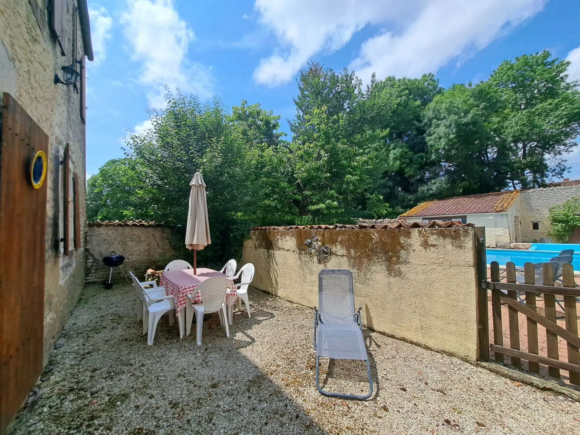 This single-story light filled home, would be ideal for someone with reduced mobility or a family, looking for a property to successfully manage as a seasonal rental. Situated on a generously sized plot with a private driveway, it offers excellent privacy from the holiday cottages. The south-facing covered terrace is a real sun trap during the many sunny days in this region, the second sunniest in France. In cooler weather, you’ll appreciate the comfort of the house, which is equipped with double glazing. There’s a fireplace which can be restored and fitted with a wood-burning stove. Two of the cottages overlook the swimming pool and the other two overlook the garden, each with its own private courtyard. A communal area is also available for guests, featuring a bread oven that’s much appreciated for baking pizzas on warm summer evenings! The large heated swimming pool (66 m²) with its jacuzzi is a major draw for both children and adults, thanks to its varying depth from 30 cm to 2 meters. The property is fenced and equipped with a security alarm, but some holidaymakers with young children choose to stay in the two cottages without direct access to the pool. Older children and adults enjoy the direct access from the two other houses and from the barn, which has been converted into a games room. The property is located in a small, quiet hamlet, 13 minutes from Saint-Jean-d’Angély, a charming historic town, and an hour from the coast and La Rochelle airport.