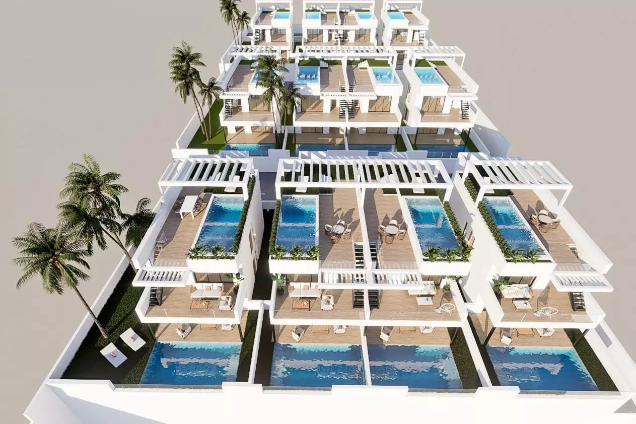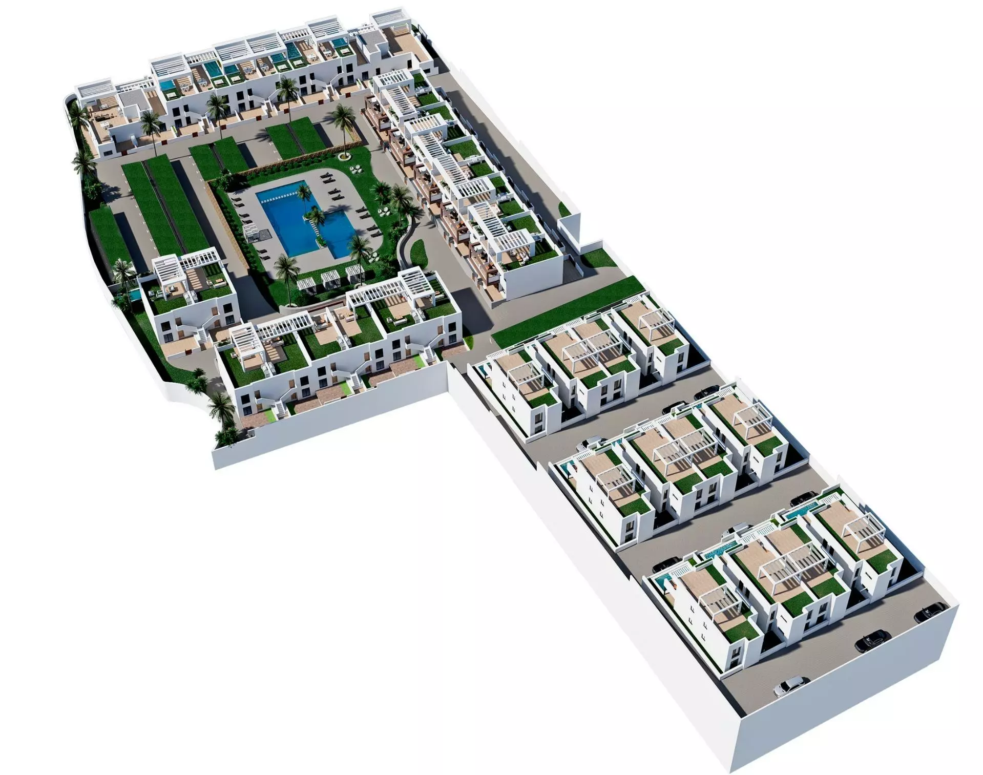 In the heart of Finestrat, a new construction residential complex is taking shape. This location is noted for its appeal on the Costa Blanca, making it an interesting option for potential homeowners. The complex consists of 60 bungalows, each featuring either two or three bedrooms along with two bathrooms. This layout caters to various living arrangements, whether for families, couples, or individuals.