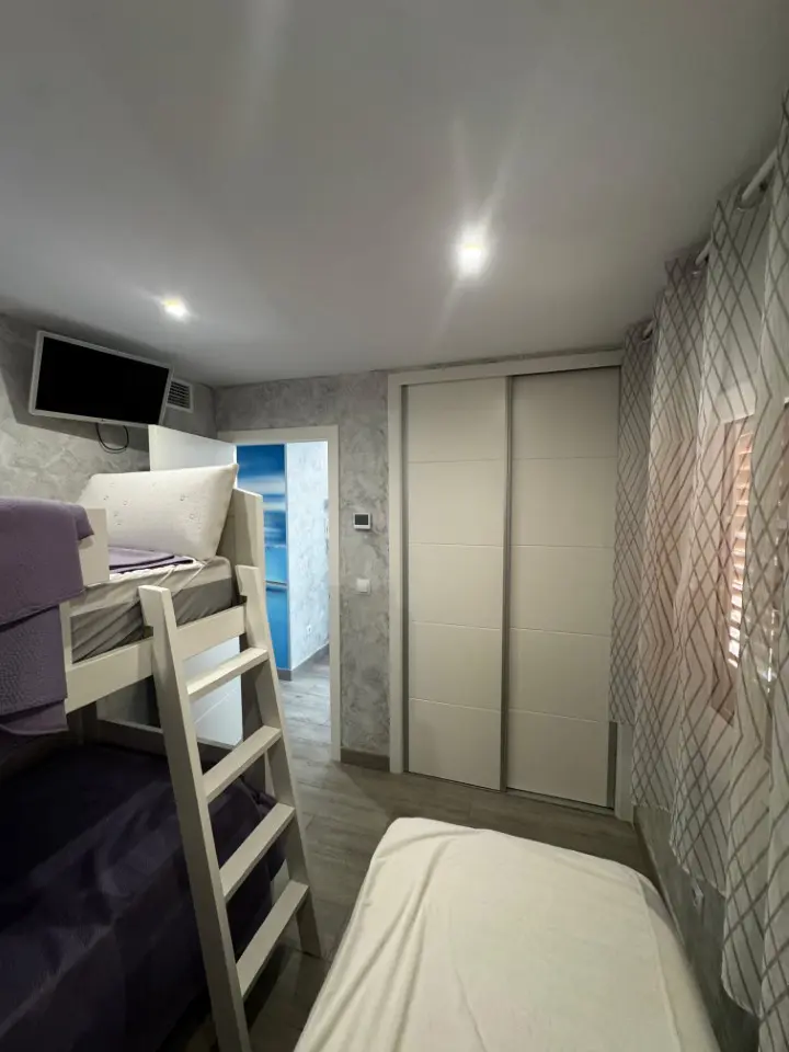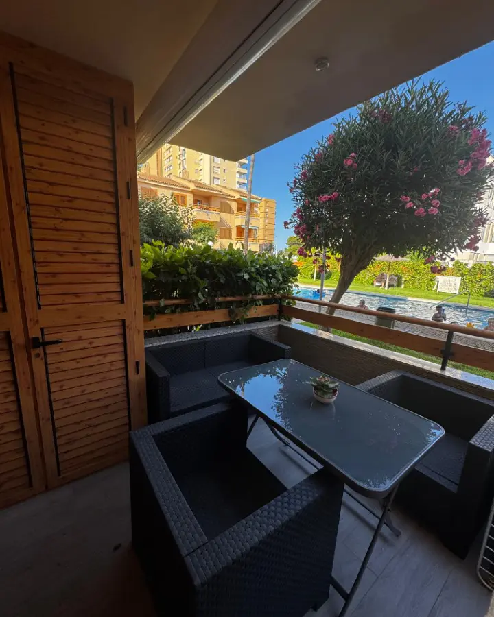 This fully renovated apartment features a terrace that provides direct access to a green area and the communal pool. The living-dining room connects seamlessly to the terrace, enhancing the indoor-outdoor living experience.