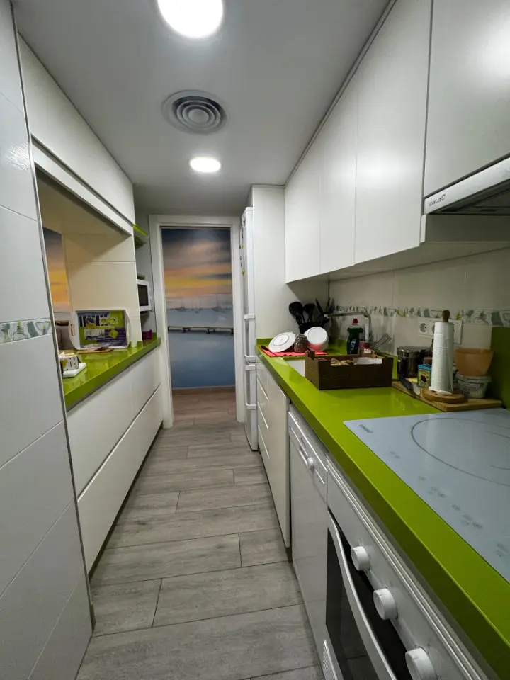 The kitchen is open-plan, allowing for easy interaction with guests or family while preparing meals. There is a utility room attached, which adds functionality to the space. Additionally, the apartment has a full bathroom with a window, further enhancing light and ventilation.