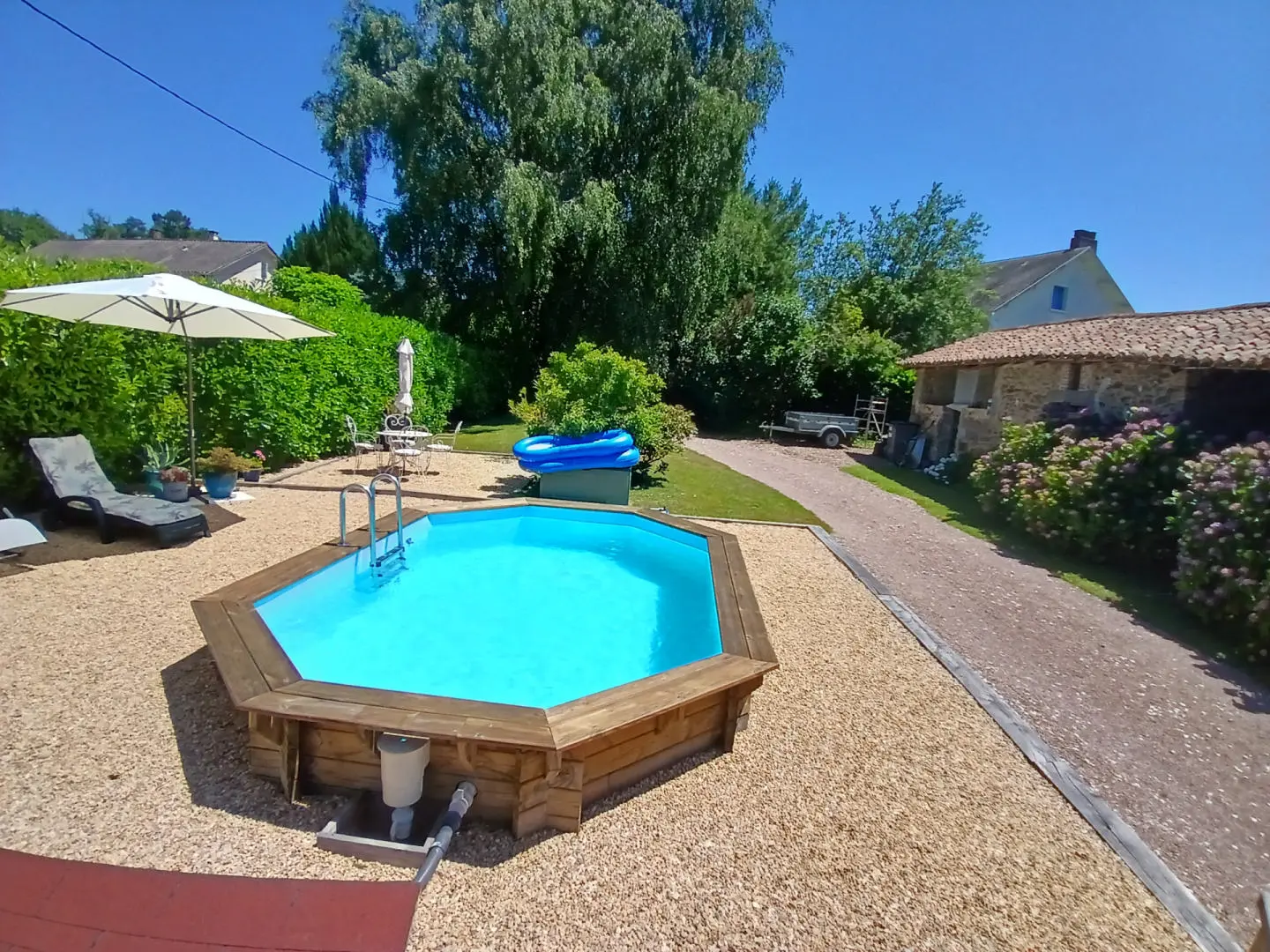 There is an outbuilding currently being used as a summer kitchen, a storage area, and a workshop. There is plenty of scope to change the use of this. The gardens are mature with an abundance of trees and established shrubs. There are lawned areas and gravel driveways with entrance gates. The pool is partly sunken into the ground and measures 5 x 4.