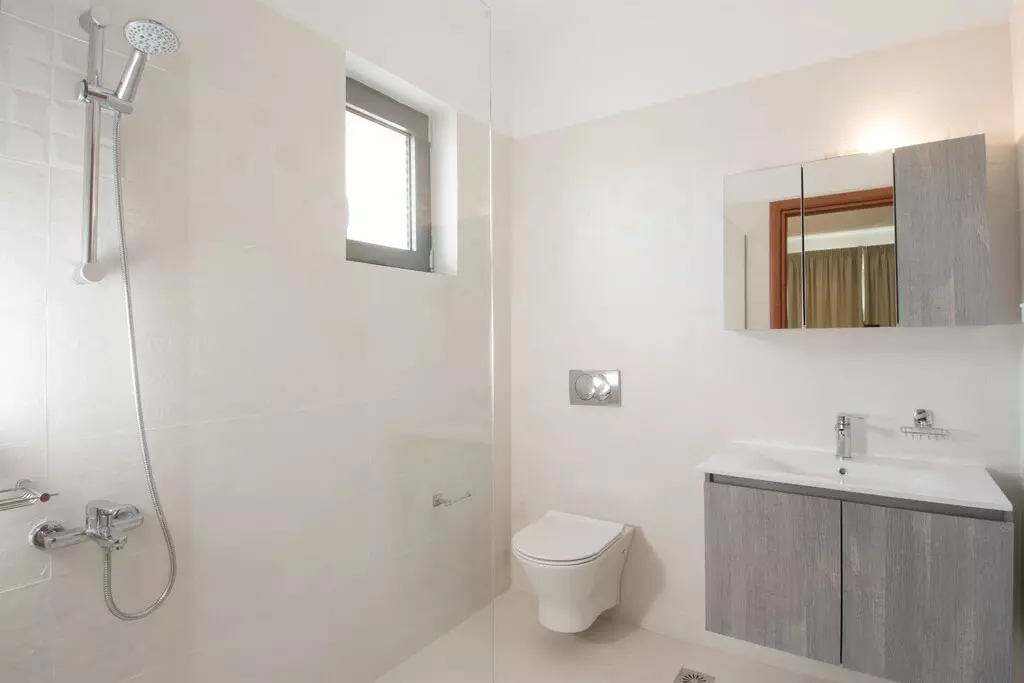 The ground floor of this villa features one cozy bedroom, a spacious living room adorned with a kitchen, and two well-appointed bathrooms—one with a shower and one additional WC. It’s the perfect setup for entertaining or simply enjoying a quiet evening at home. The open layout offers plenty of natural light, creating an inviting atmosphere.