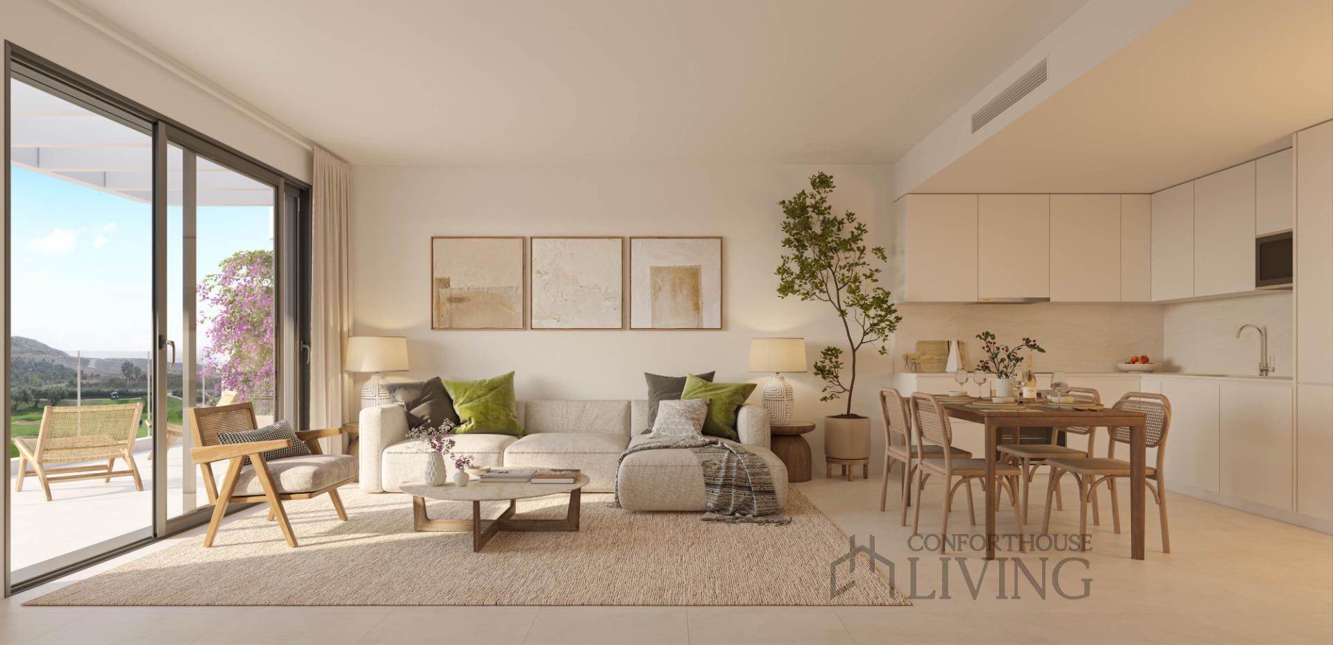 The living spaces at Bahía are designed for comfort and elegance. Whether you’re standing on your private terrace, enjoying a duplex’s solarium, or relaxing in the garden of a ground-floor unit, you’ll find every inch of your home is thoughtfully connected to the lush common areas through expansive floor-to-ceiling windows. This design pulls in sweeping views of the surrounding landscape, making every moment special.