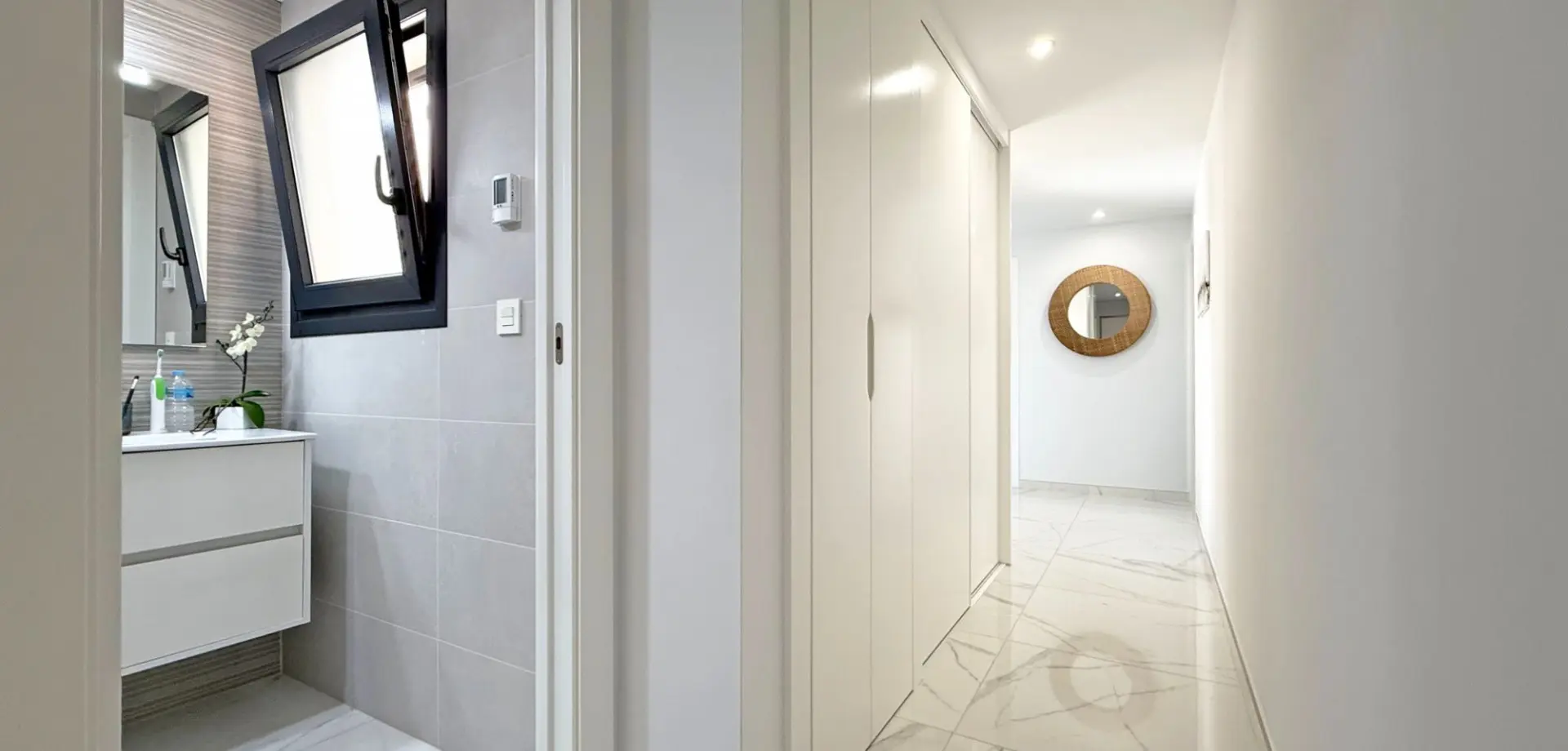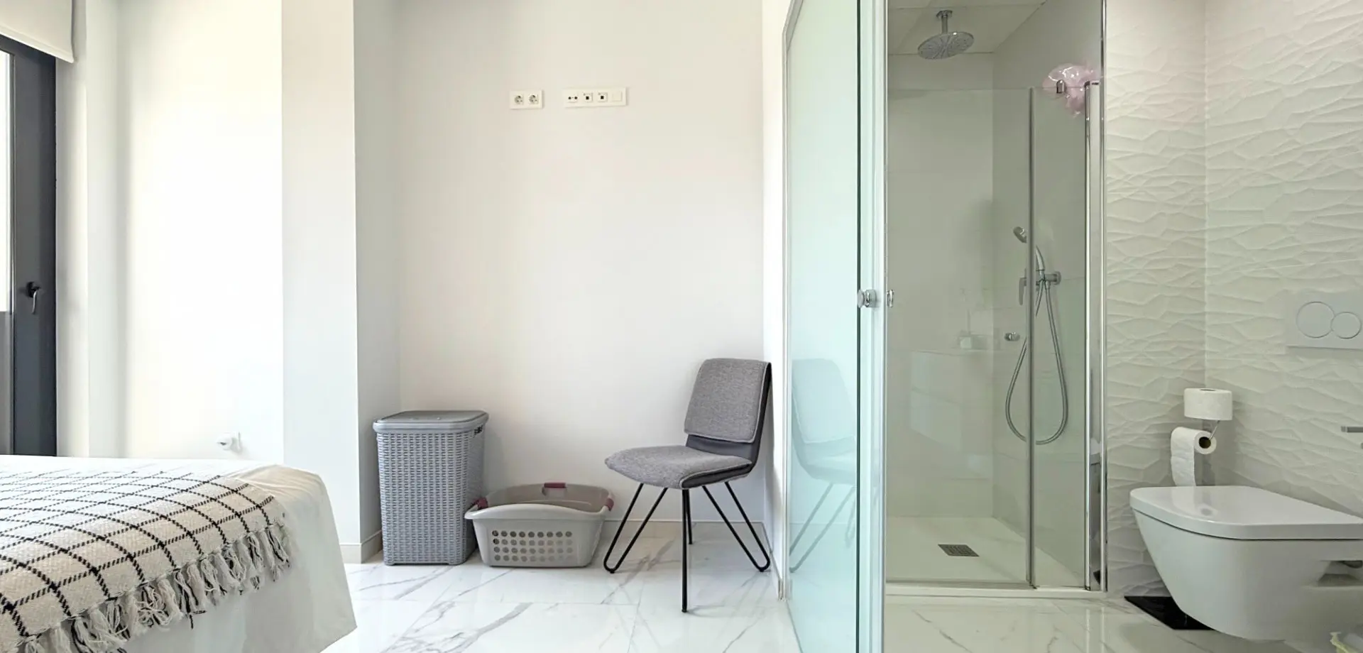 The bright and spacious open-plan living and dining area leads seamlessly out through sliding doors that come fitted with mosquito nets for year-round comfort. Whether you’re entertaining friends or just enjoying a quiet evening, this layout makes it all possible. Plus, the large private balcony features a glazed enclosure, creating a cozy, protected space to savor the outdoors, even on those cooler evenings.