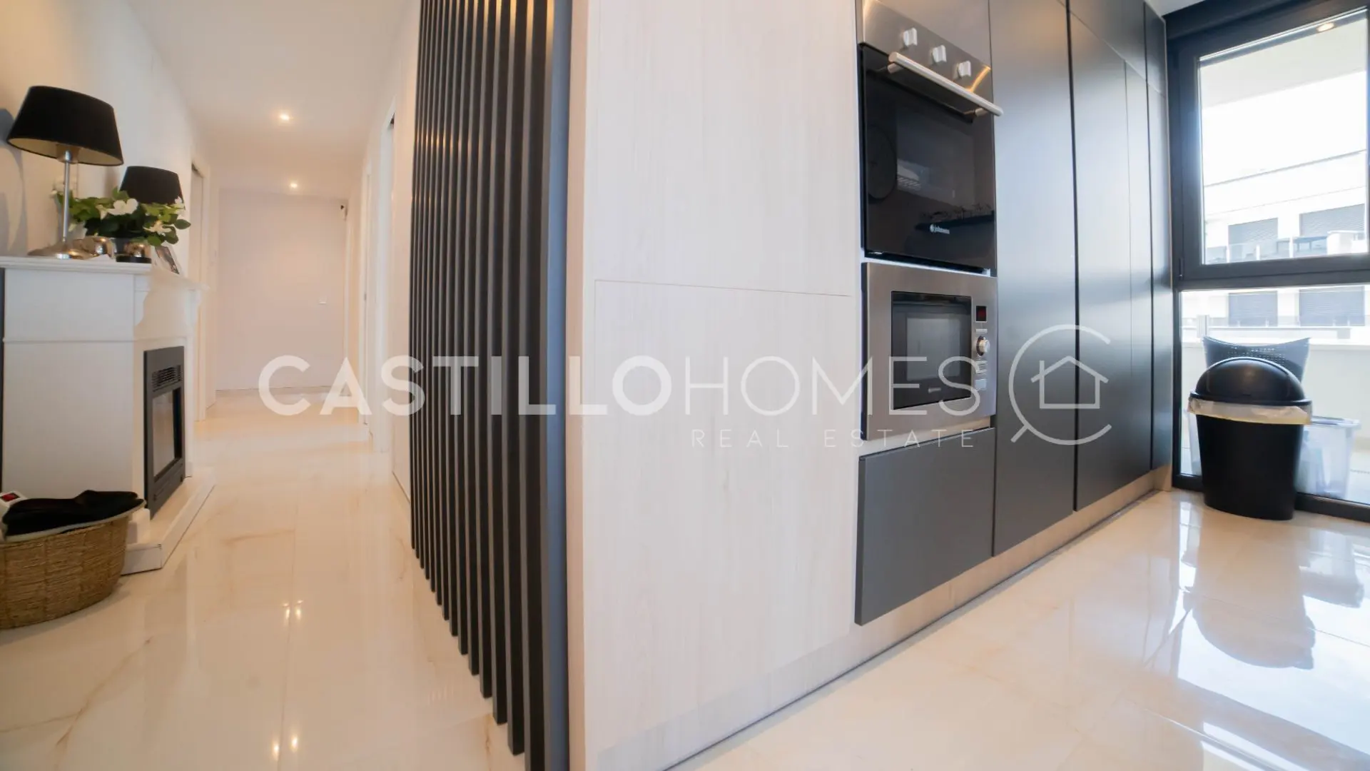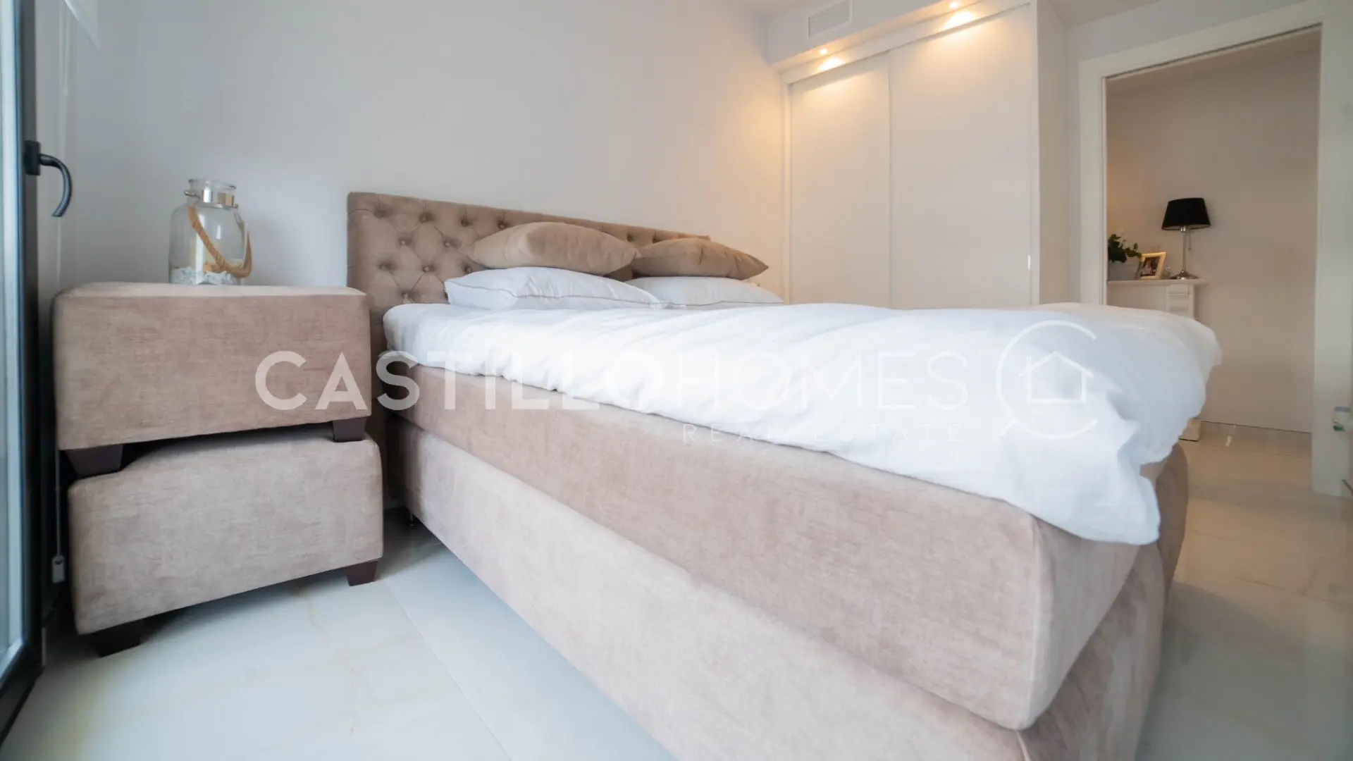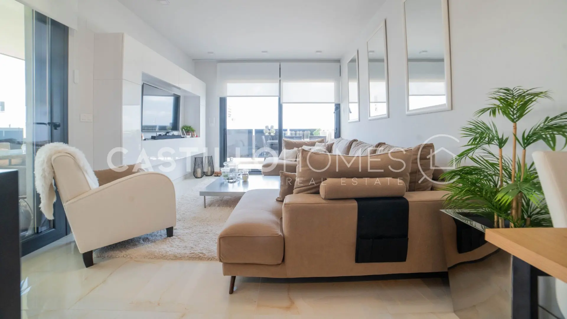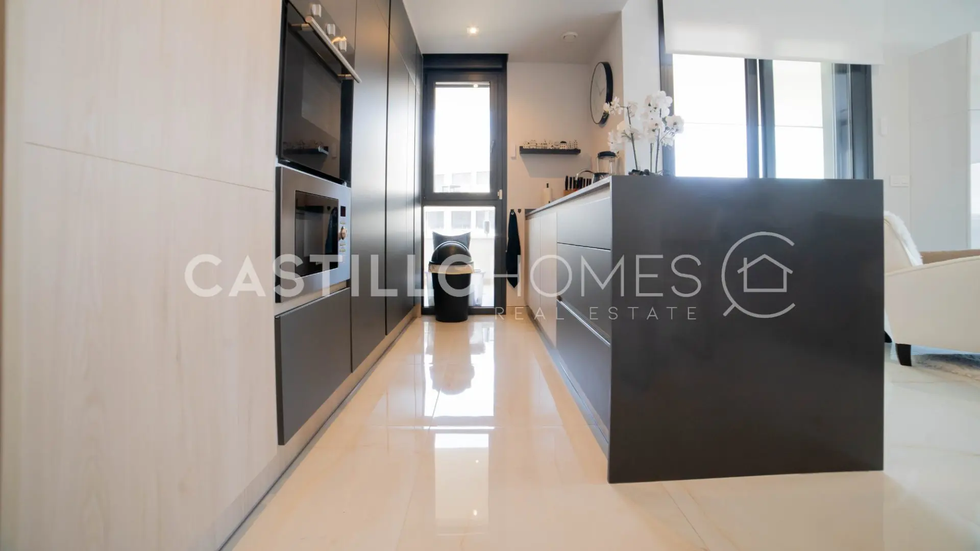 The heart of the home is the open-plan kitchen that flows seamlessly into the living room. It’s a space designed for those perfect moments when family and friends can gather, cook together, and catch up without anyone feeling left out. Large glass doors blur the boundary between inside and out, leading you to the fantastic terrace stretching along the full length of the apartment. From here, you have an amazing sea view that turns every morning coffee, lunchtime snack, and evening drink into a moment to cherish.