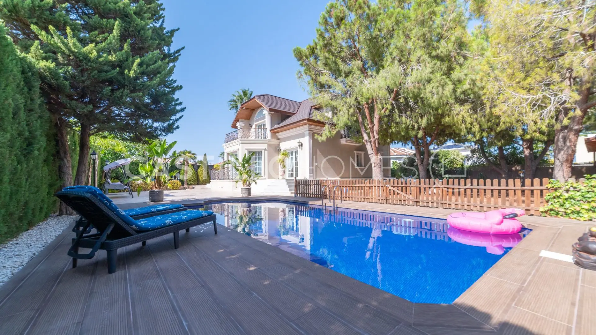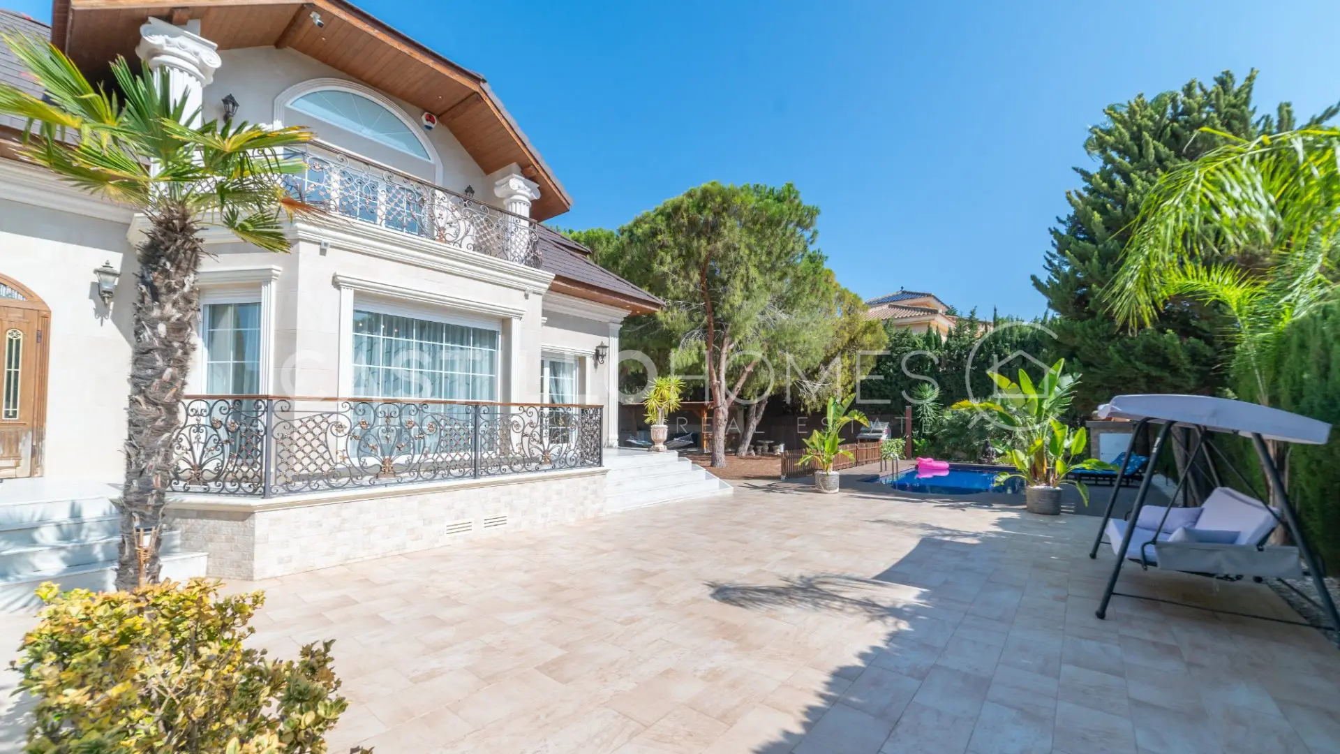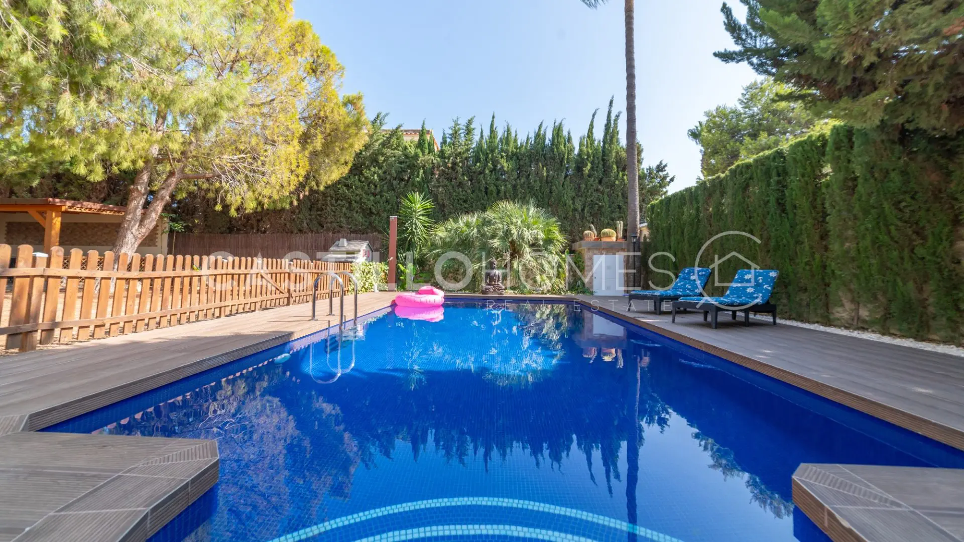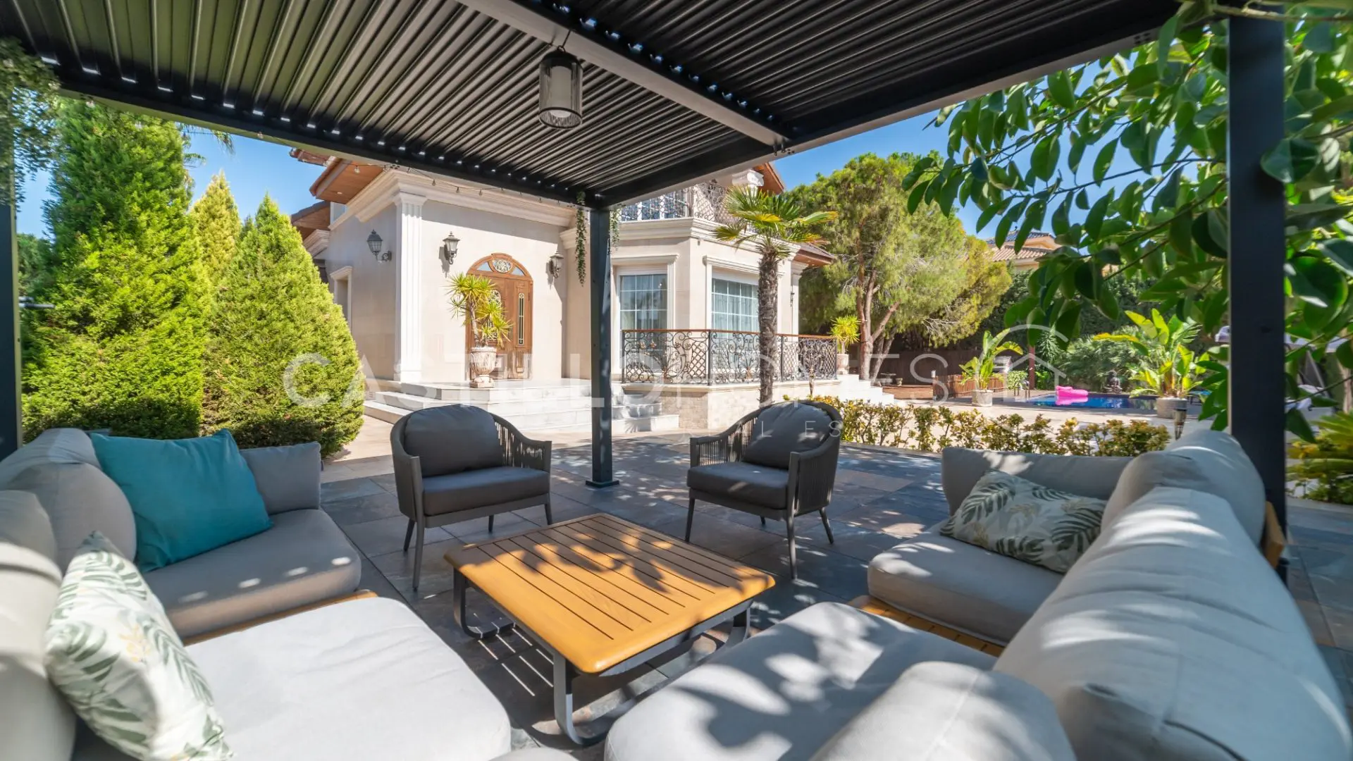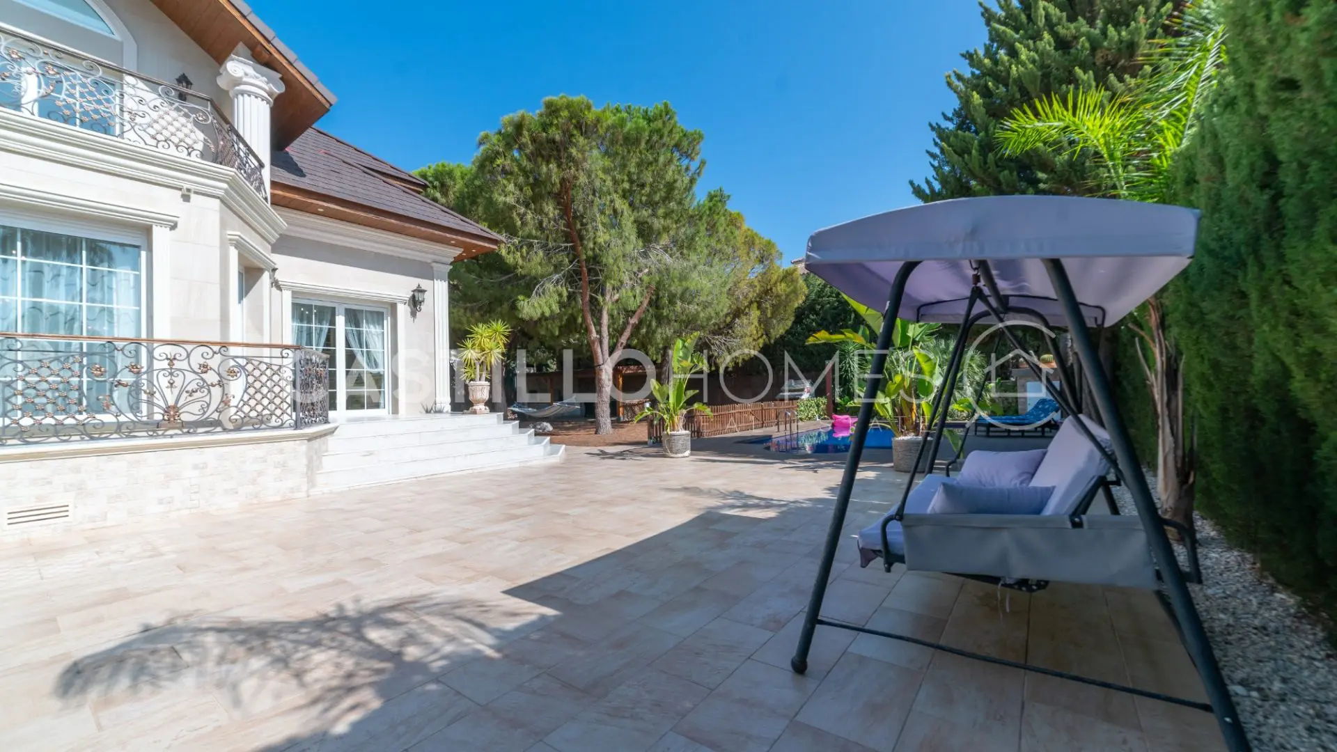 As you step inside the property, you’re welcomed by lush greenery and an array of trees that create a soothing atmosphere. To your right, there’s a cozy lounge area that’s perfect for enjoying a book or just unwinding in the shade. Directly in front of you is a well-kept swimming pool, an oasis where you can take a refreshing dip during those warm summer months.