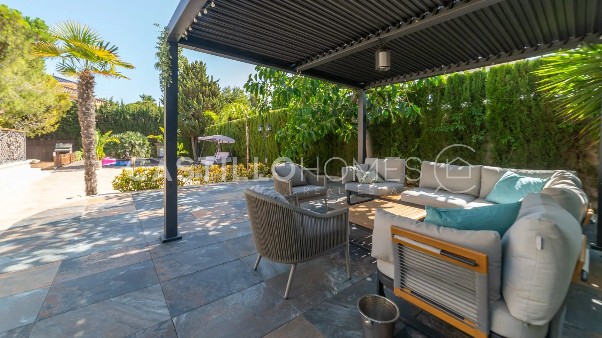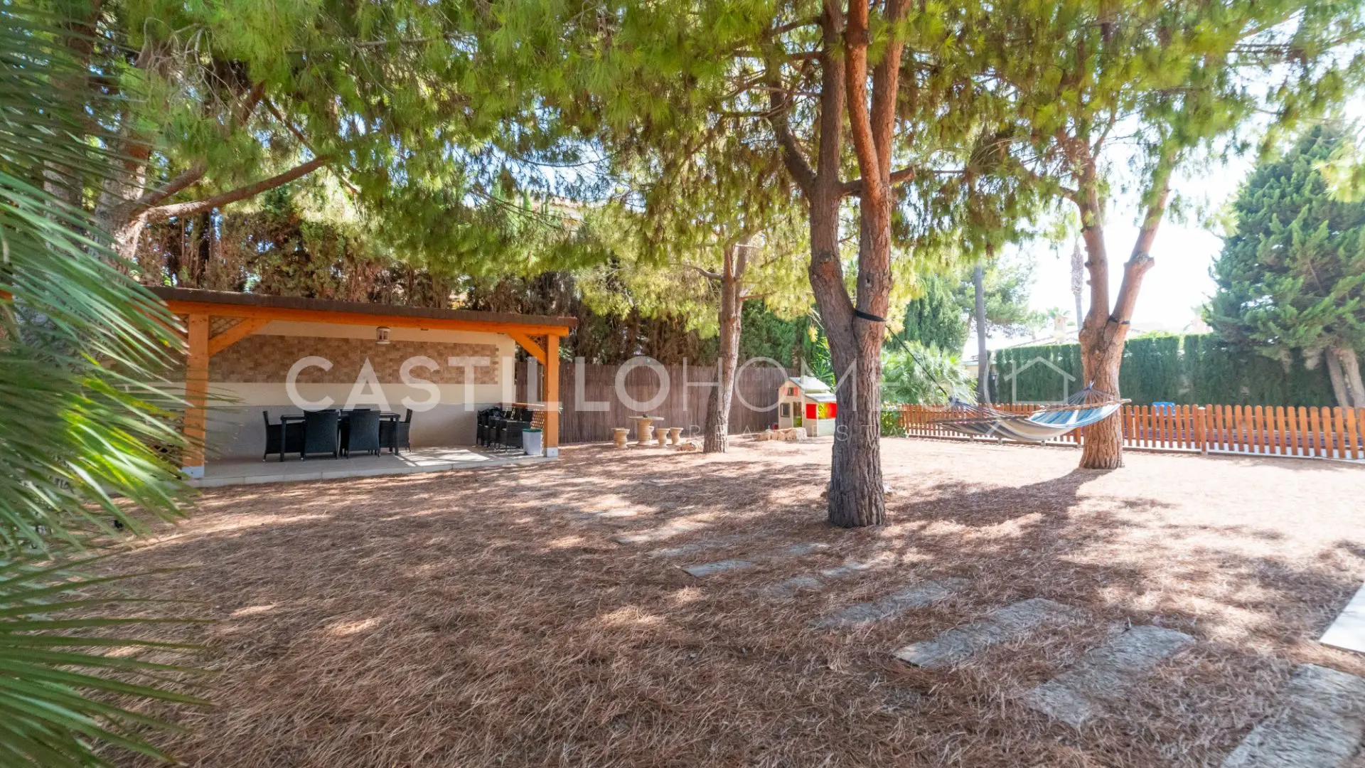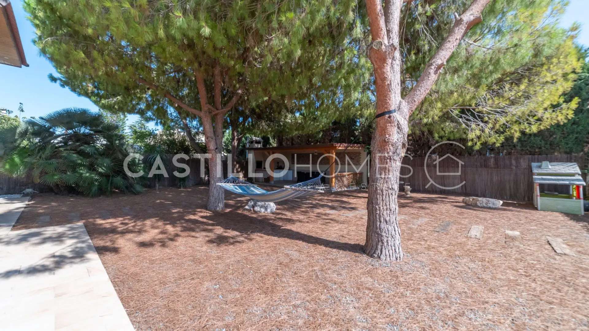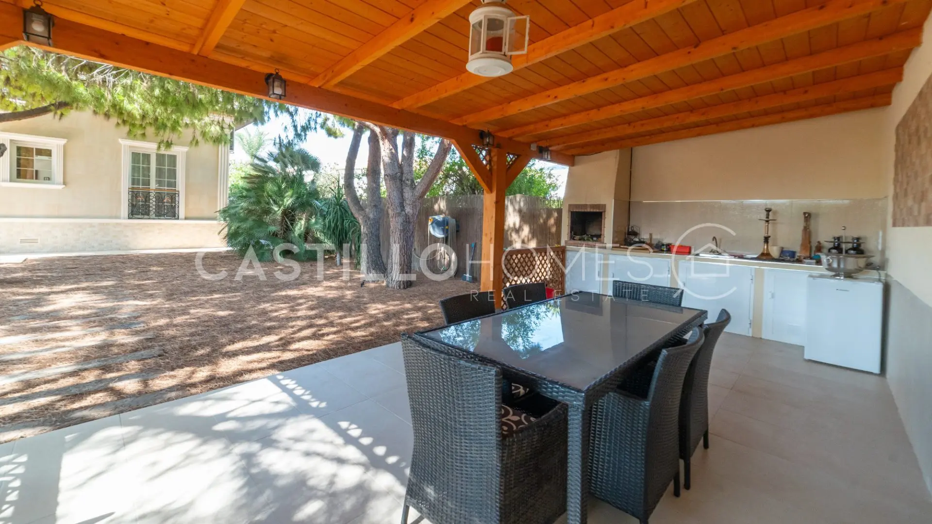 Adjacent to the pool, you’ll discover a beautifully landscaped garden featuring large, leafy trees and a hammock—just imagine lounging here with a cool drink in hand. This outdoor space includes a modern kitchen perfect for al fresco dining, complete with a dining table, barbecue, and even electricity. Hosting gatherings here would be a breeze!
