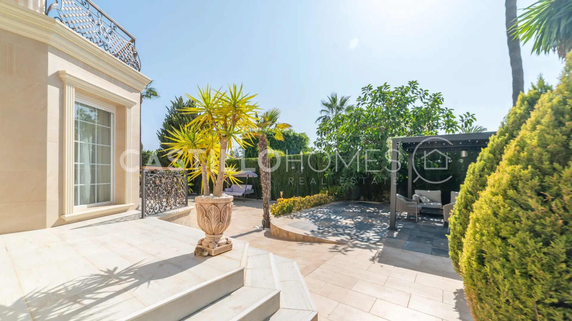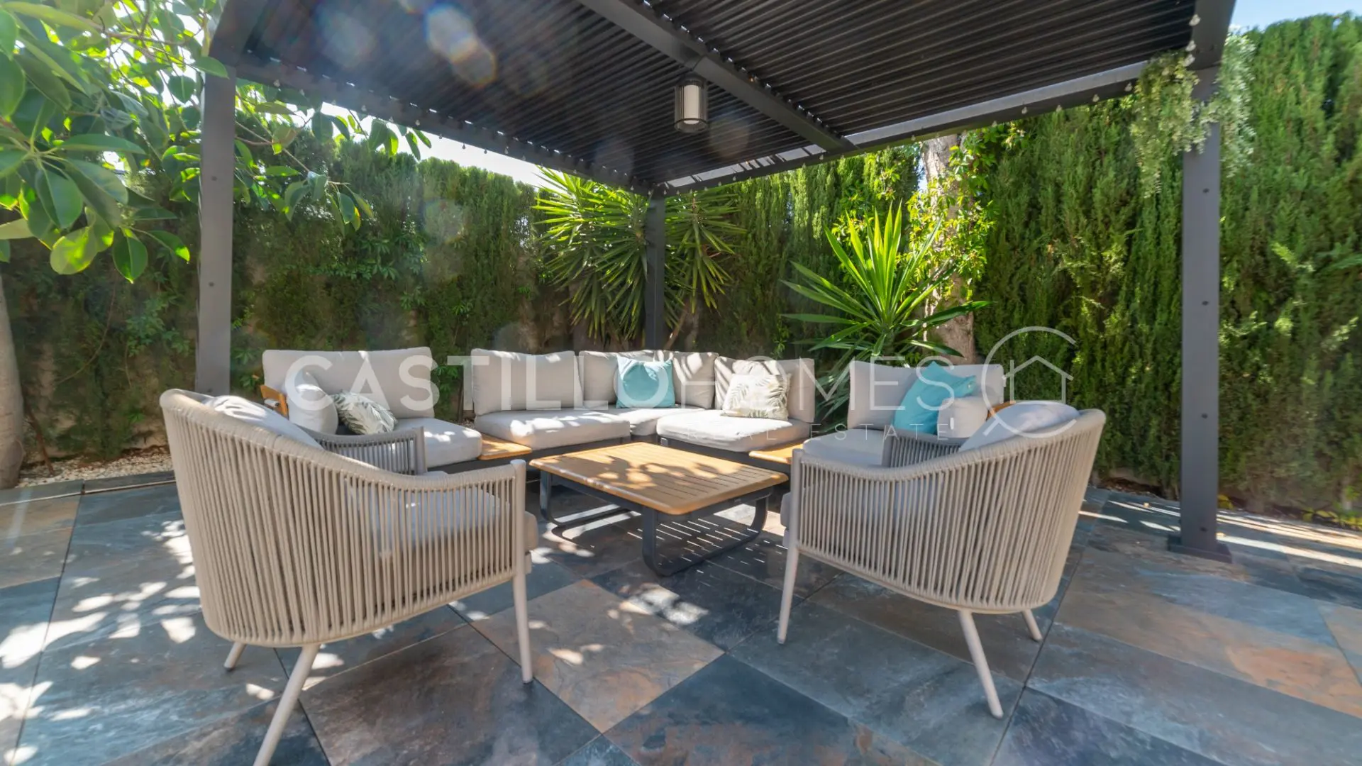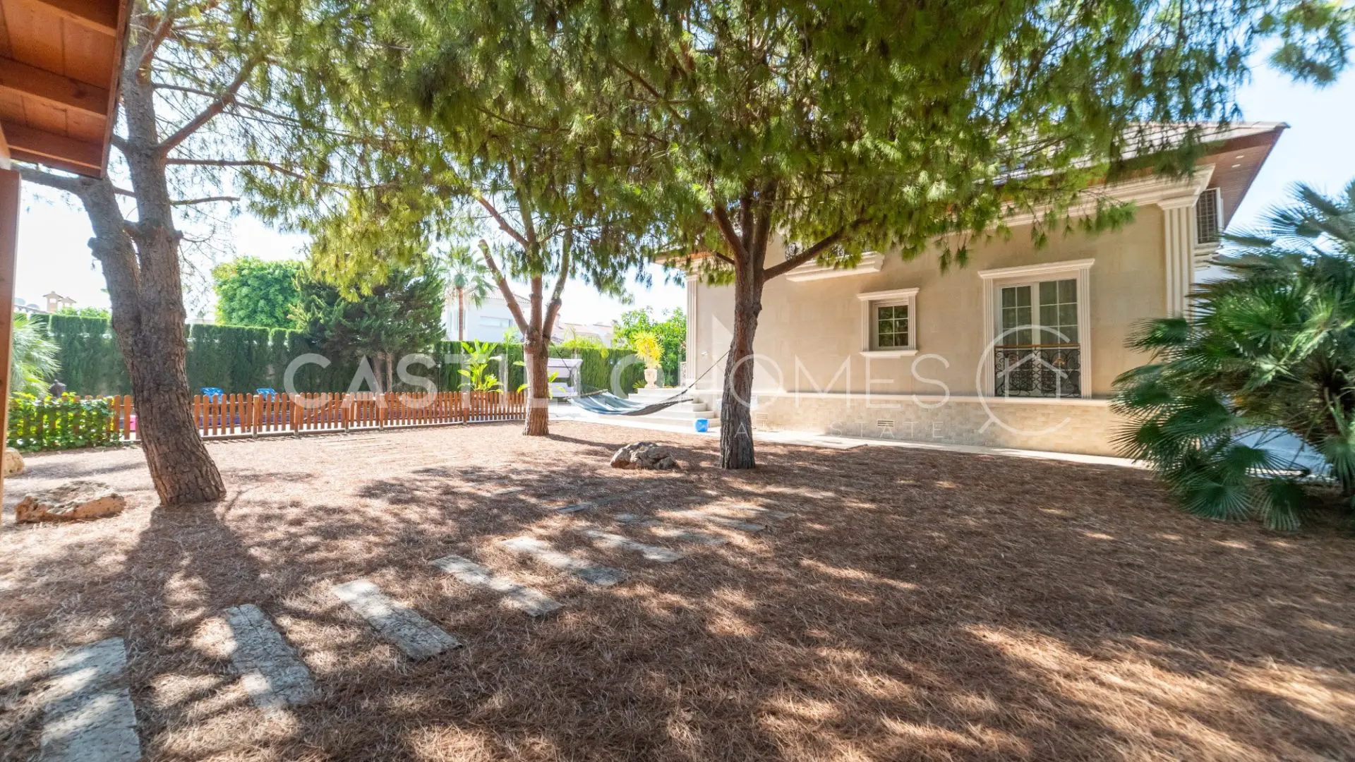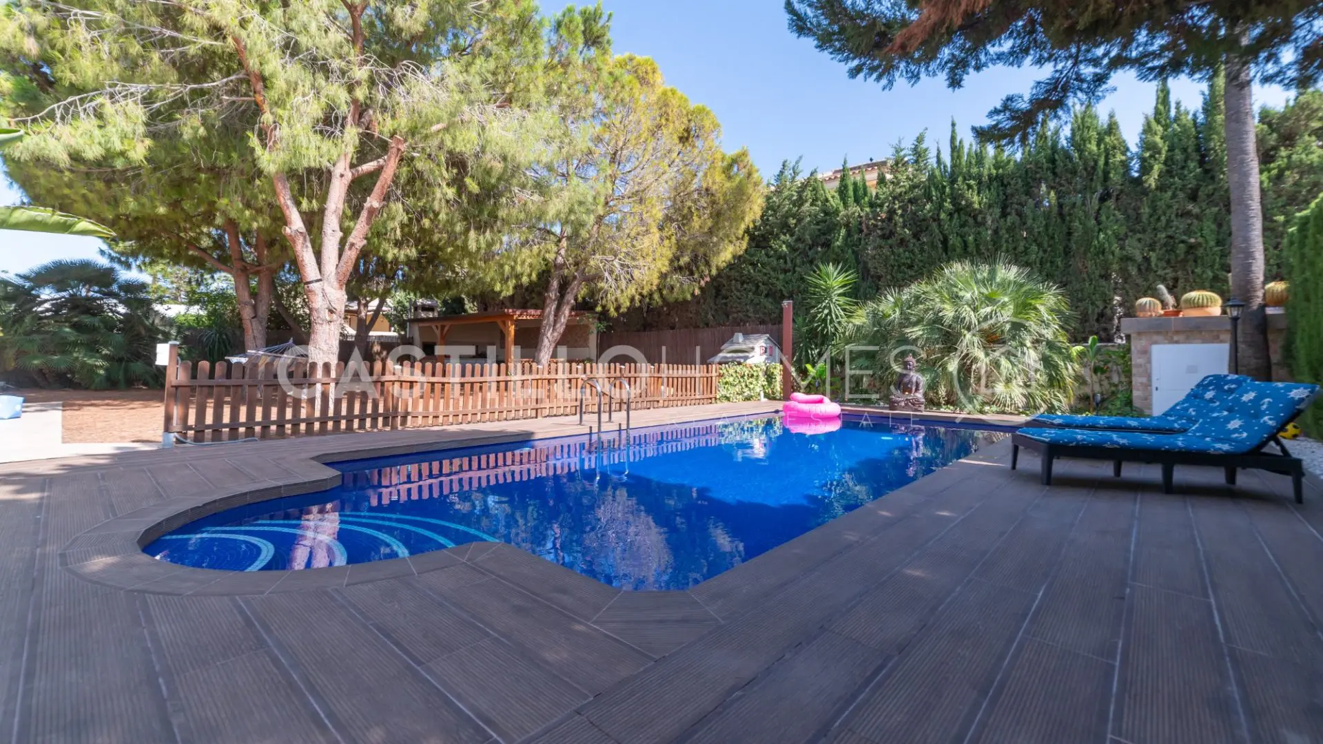 Adjacent to the pool, you’ll discover a beautifully landscaped garden featuring large, leafy trees and a hammock—just imagine lounging here with a cool drink in hand. This outdoor space includes a modern kitchen perfect for al fresco dining, complete with a dining table, barbecue, and even electricity. Hosting gatherings here would be a breeze!