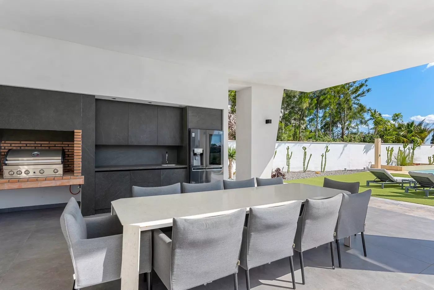 Step outside, and you’ll find the heart of the outdoor area—a stunning infinity pool that seems to blend seamlessly with the ocean beyond. It even features a special shallow area for children, so everyone can enjoy a splash. Surrounding the pool, you’ll discover several recreational spaces. There’s a fully equipped outdoor kitchen for barbecue nights, a cozy lounge area with a fireplace for intimate evenings, and multiple terraces, ideal for dining under the stars or simply soaking up that Vitamin D.