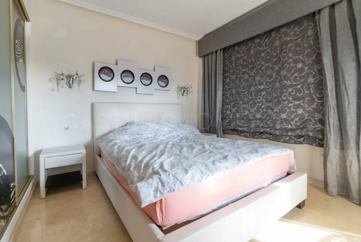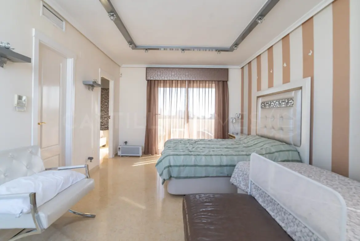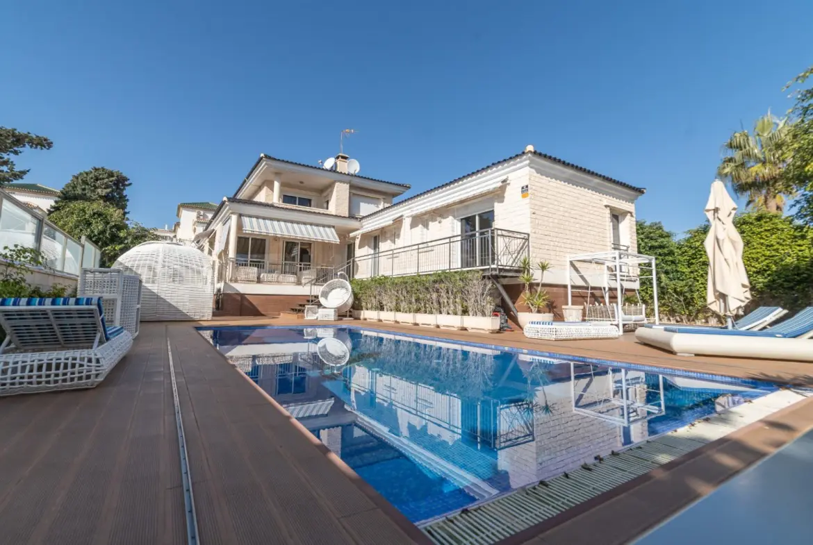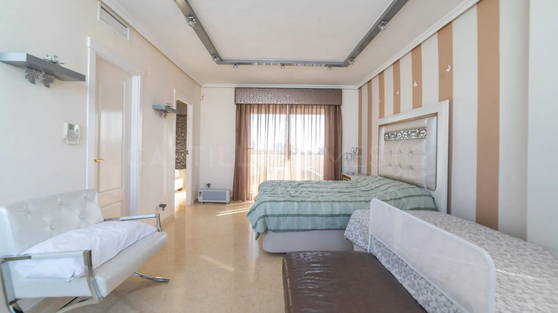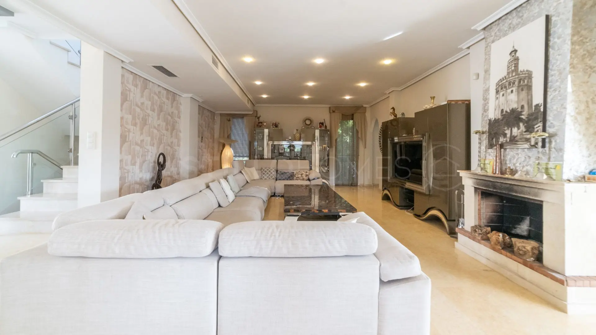 As you step into the ground floor, you’ll be greeted by a bright and airy living room showcasing open-concept spaces. The center of attention is the beautiful fireplace, which offers a warm and inviting atmosphere. This floor also includes three well-sized bedrooms and three bathrooms, ensuring a blend of privacy and socializing. You’ll also find access to an L-shaped terrace from the living room and two of the bedrooms. This terrace stretches gracefully across the back of the house, providing a serene view of the pool and lush garden – the ideal spot for enjoying sunny days in comfort, as well as hosting BBQ dinners or relaxing outdoors.