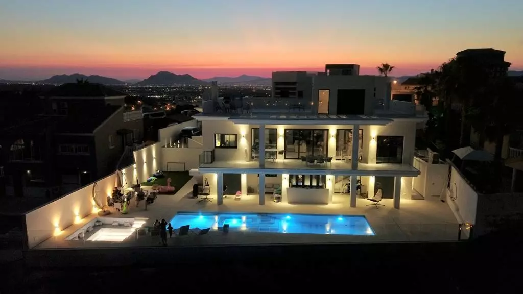 Step into the spacious salon and lounge area, measuring roughly 65m² with soaring 3-meter-high ceilings. Admire views that stretch across the valley to the coastline. The space gracefully transitions into an internal winter garden adorned with a unique green wall, perfect for cozy gatherings. The bespoke floating staircase adds a touch of modern flair and leads you to various levels of the home, including an incredible roof solarium.
