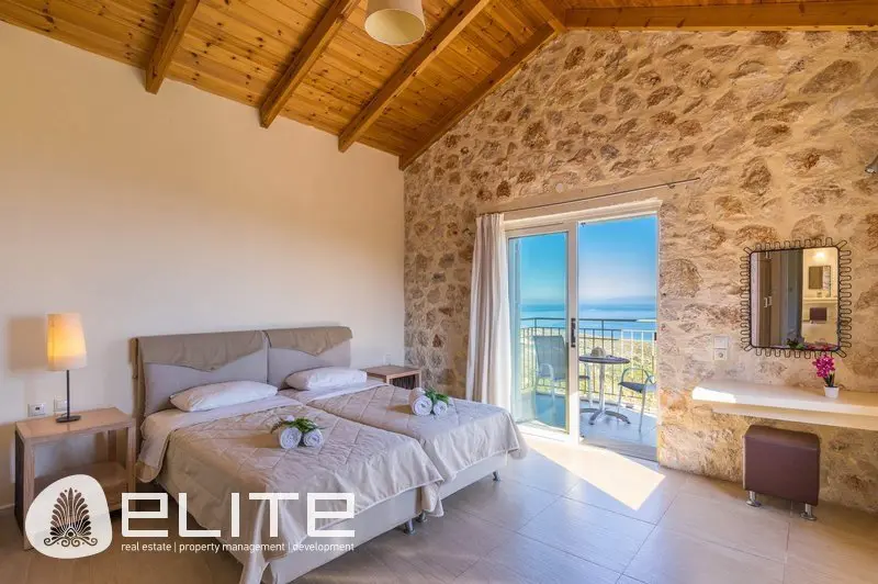 At the heart of this gorgeous property lies a stunning ‘T’ shaped stone villa, enveloped by nature and crafted to the highest quality standards. Spanning 230 sq.m., this villa overlooks the charming village of Skala and the shimmering Ionian Sea. Imagine waking up to panoramic vistas that soothe your soul and connections to nature that seem almost magical.