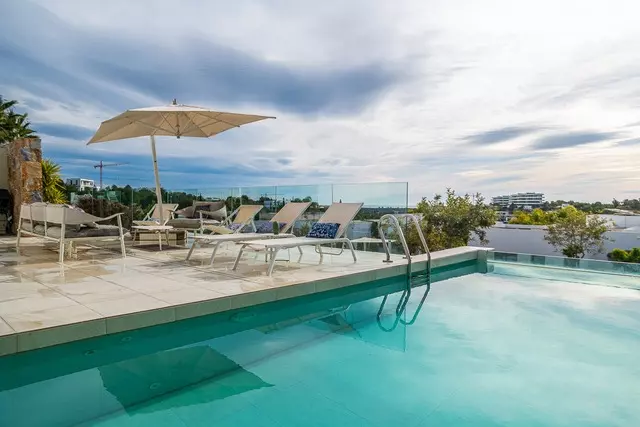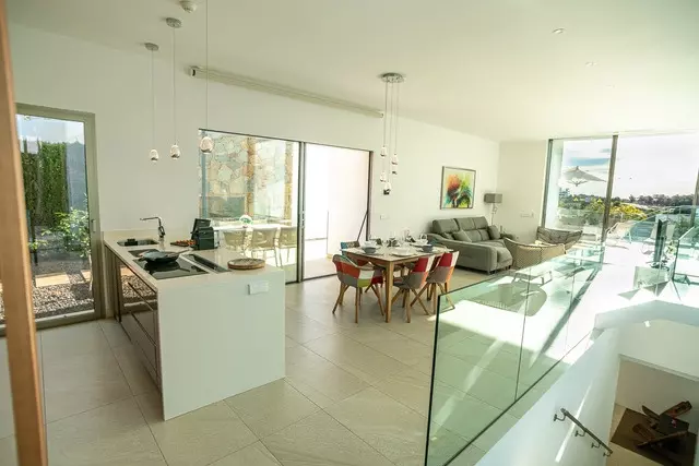 This luxury villa boasts two private parking spaces and a beautifully landscaped front garden that sets the tone for elegance right from the entrance. The seamless indoor-outdoor living experience is unparalleled, with panoramic views of the lush golf course and the sparkling sea. Picture yourself lounging by the private pool that runs the length of the villa, especially magical when illuminated at night.