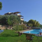 The exterior includes features like awnings for shade, a barbecue area for outdoor cooking, and a personal swimming pool, suitable for private use. For convenience, there’s also a designated parking space available with the property.