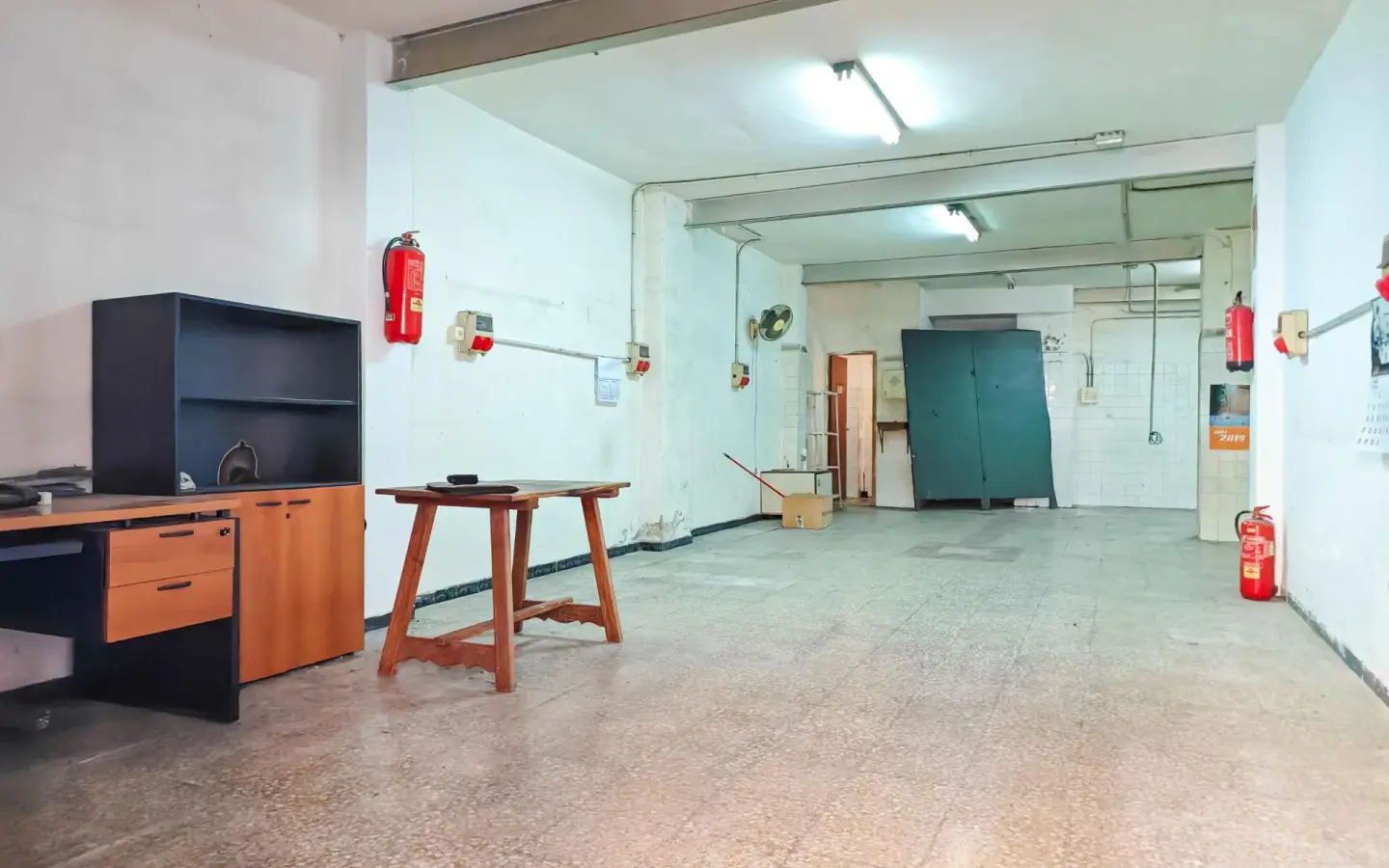 It includes a basic toilet with its own ventilation, an updated electrical panel with industrial-type sockets, and identification of the building’s water downpipes. The entrance is direct from the street, protected by a security metal roller shutter and interior carpentry doors.