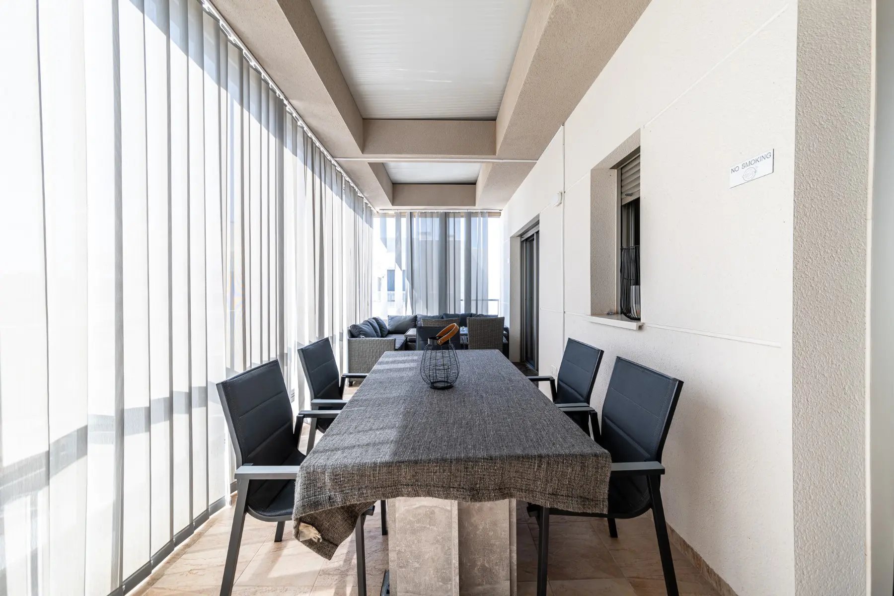 This modern penthouse features three bedrooms that can accommodate up to six people. It includes two bathrooms, an open living area combined with the kitchen, a sunny balcony, and a notable private rooftop terrace of approximately 50 m². This outdoor space provides an ideal setting for relaxing on sunny days or enjoying evenings outdoors.