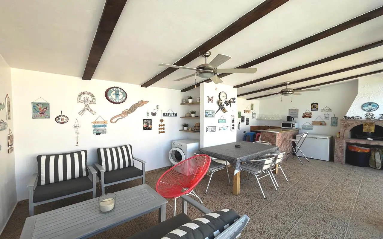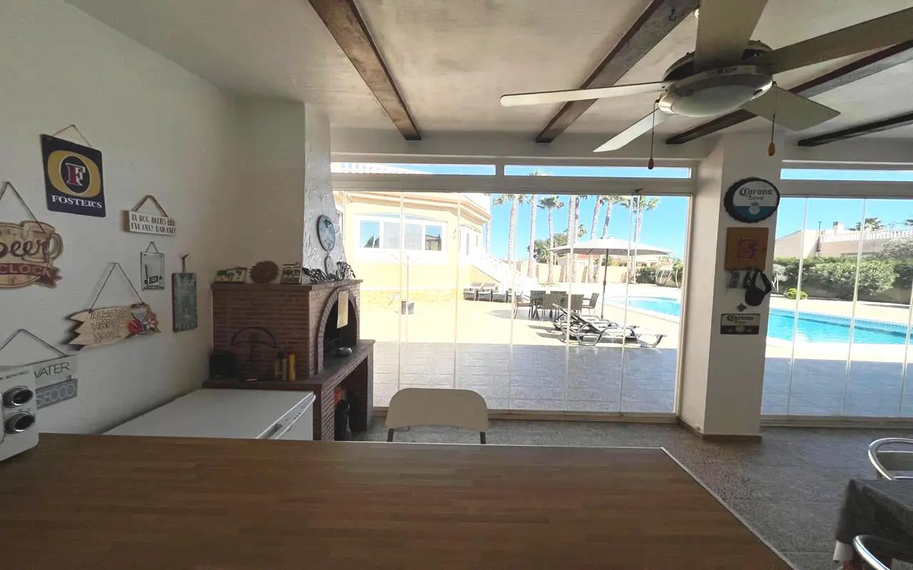 The garden surrounding the villa is enclosed by walls and has been landscaped with a focus on ease of maintenance and creating an environment for relaxed outdoor living. Key features of the outdoor space include a private swimming pool that measures 12 by 6 meters. There is also a carport, and sufficient space for off-road parking. The garden contains mature palm trees and established plants. A barbecue area is present, along with a glazed summer house that measures 28 square meters. This summer house is equipped as an outdoor barbecue kitchen. An outdoor shower room is also available. For additional storage, there is a wooden shed measuring 4 by 4 meters, and small kennels suitable for dogs. The front of the property offers views of the open countryside, extending to the distant mountains, which contributes to the villa’s peaceful rural setting.