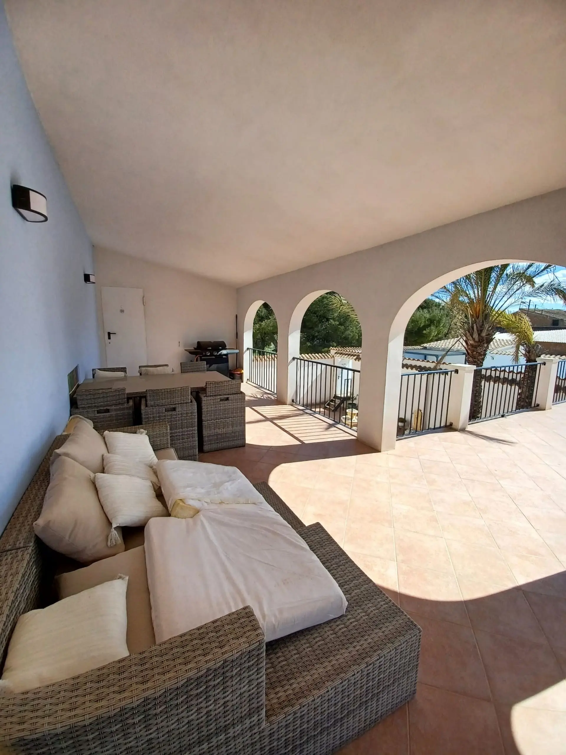 The courtyard area offers another access door to the front of the property, a WC, and a laundry room. Additionally, there is a covered seating area beneath arches, complete with an outdoor kitchen and barbecue space.