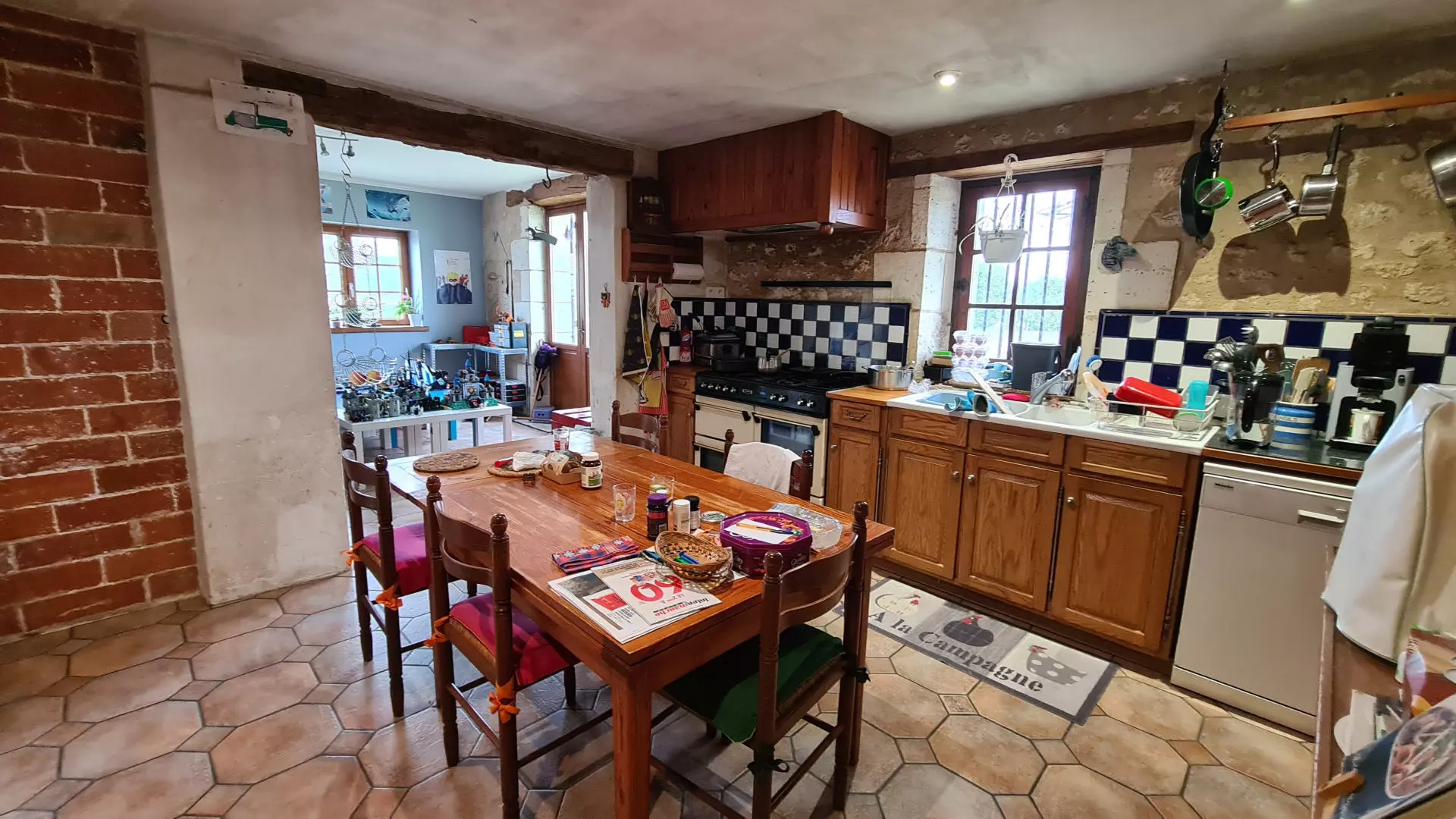 The main house has a living room equipped with a traditional Charentaise fireplace. This feature is suitable for cooler evenings. Additionally, many rooms come with reversible air-conditioning units. The combination of a dining room and kitchen provides a good area for meal preparation and gatherings with guests.