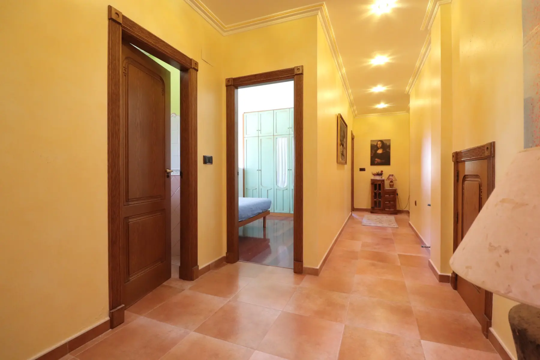 The impressive entrance opens to a hallway leading into a living room with a fireplace, and pre-installation for air conditioning and radiator. The living area includes three sets of double doors that open to the outside, allowing natural light to flow in. Adjacent is a separate family-fitted kitchen and a utility room with outdoor access.
