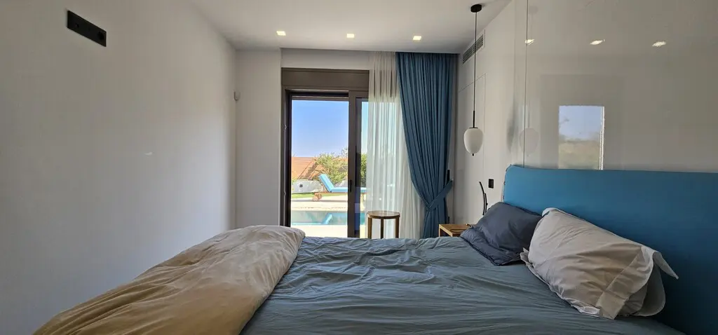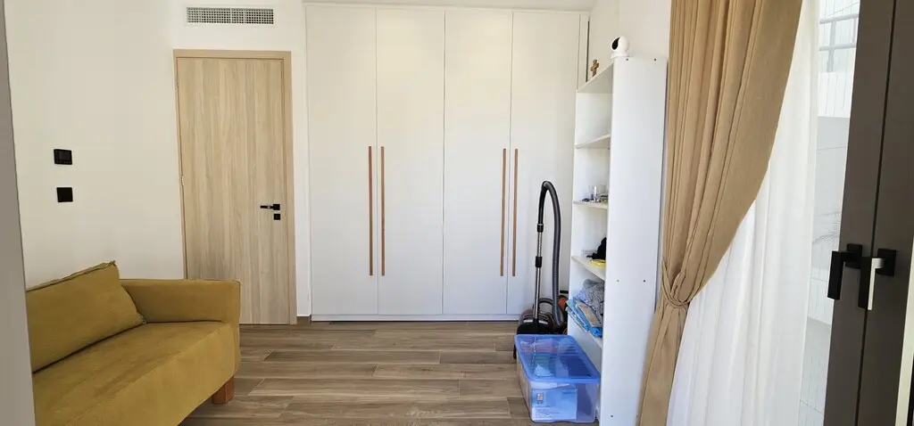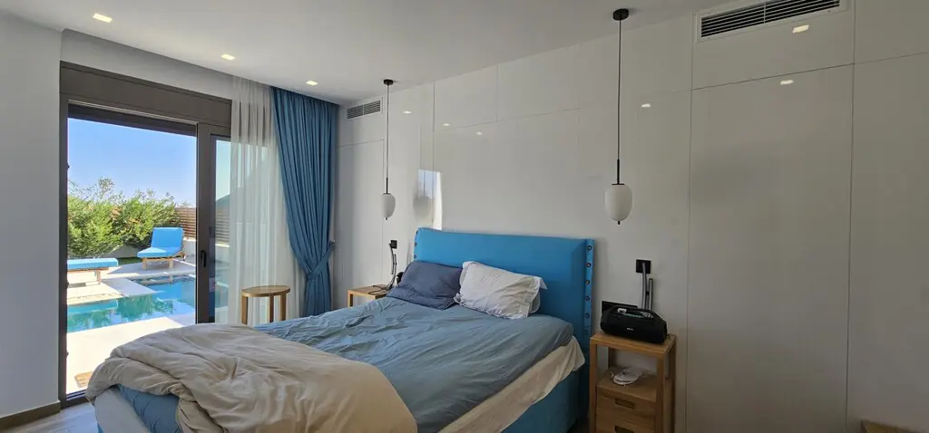 The first floor of the villa includes a living space that integrates a kitchen area, creating a seamless environment for cooking and relaxation. There is one additional shower room with a WC and another storeroom, providing further convenience.