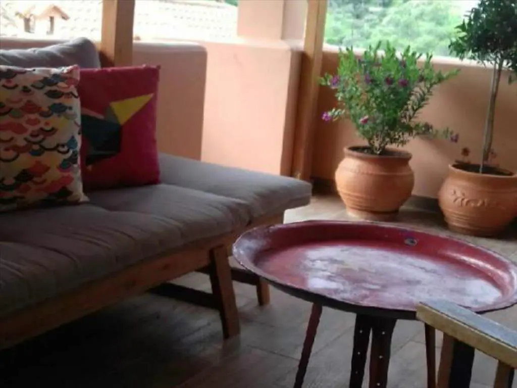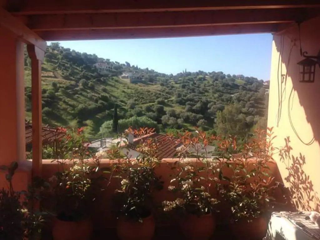 The property’s windows provide a view of the surrounding mountains, enhancing the natural ambiance. The house is equipped with practical features such as solar panels for water heating, a fireplace for the cooler months, and air conditioning to ensure comfort throughout the year.