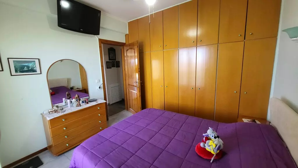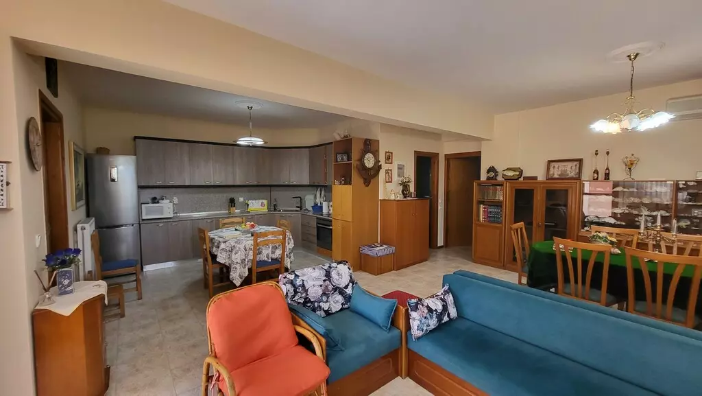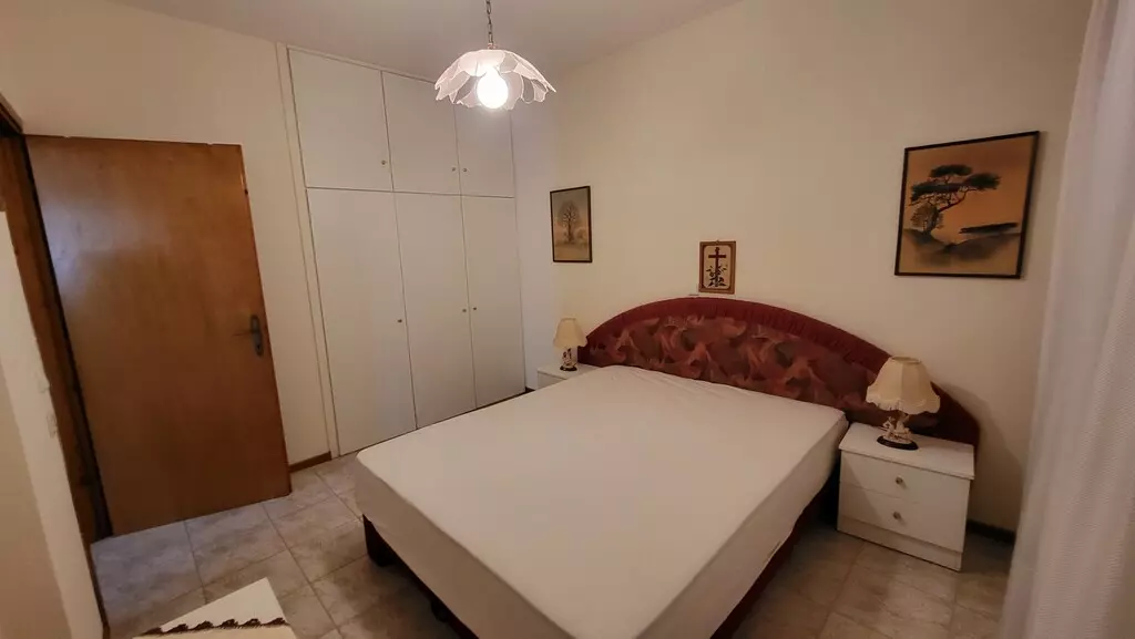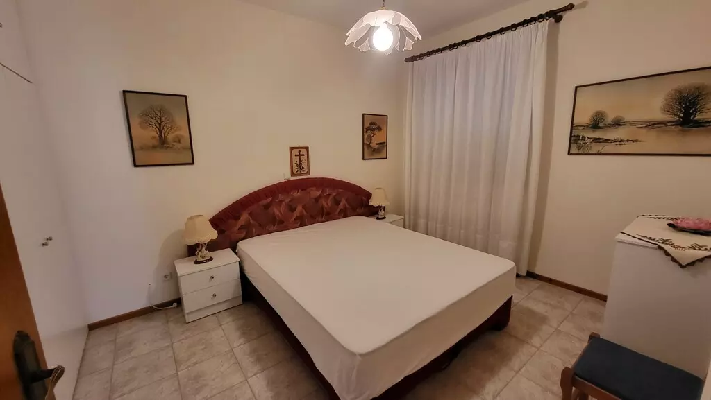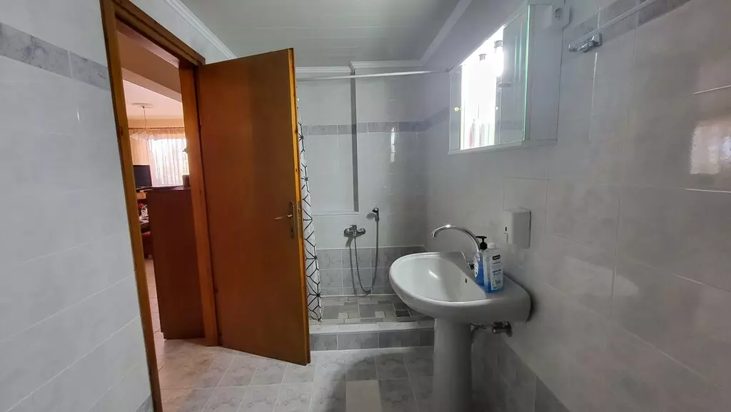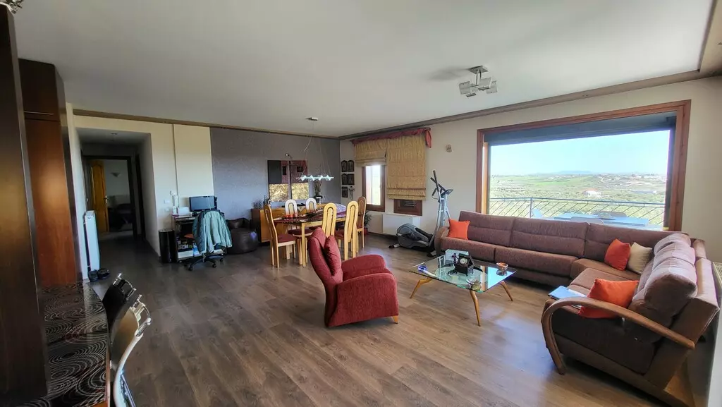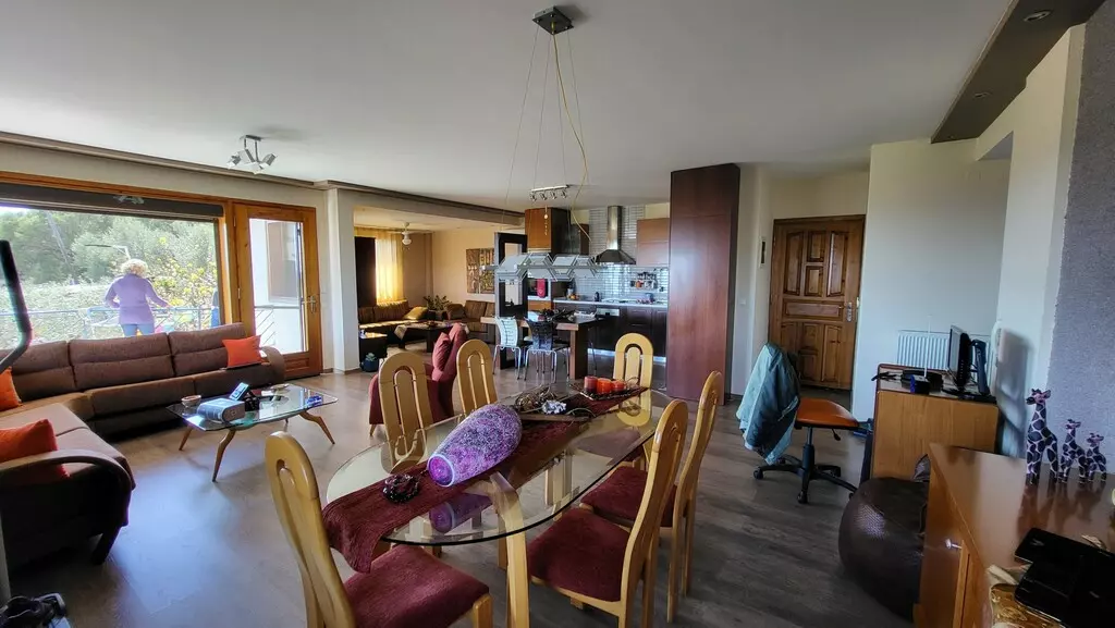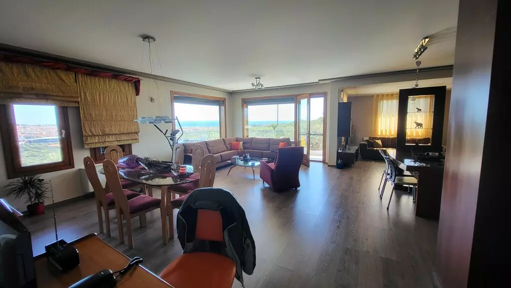 This 2-storey house in Chalkidiki offers a total area of 240 square meters. The ground floor features two bedrooms, a living room with an adjoining kitchen, one shower WC, and a storeroom. The first floor adds to the living space with three additional bedrooms, another living room with a kitchen, a shower WC, and a separate WC.