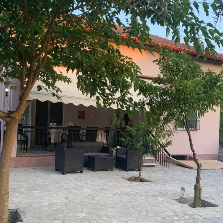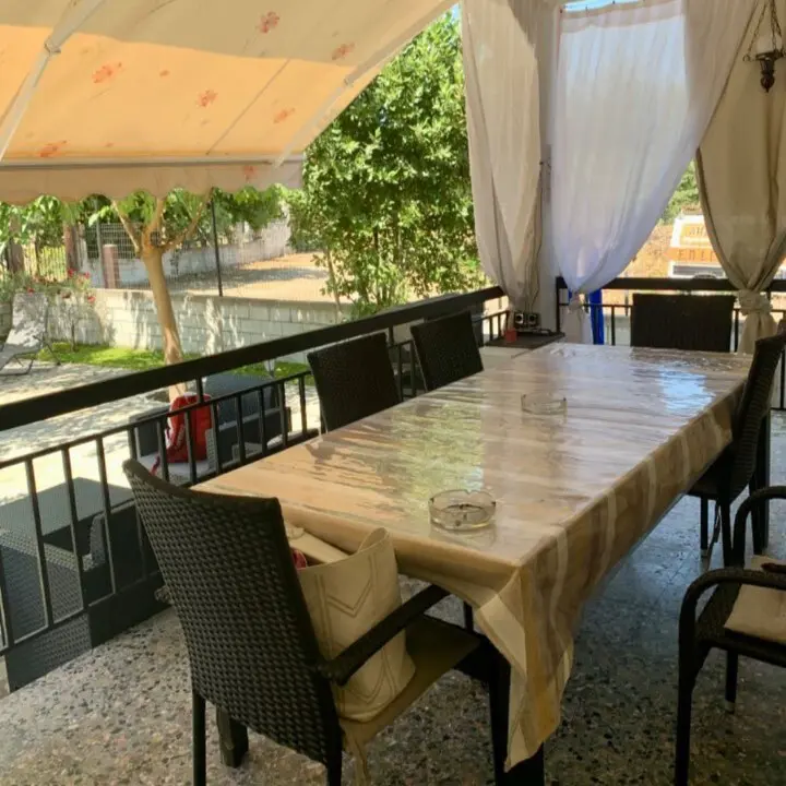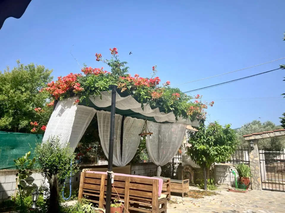 The house is designed to offer a view of the mountains from its windows, creating a picturesque backdrop. Key amenities include air conditioning, awnings for shade, and a heating system—ideal for year-round comfort.