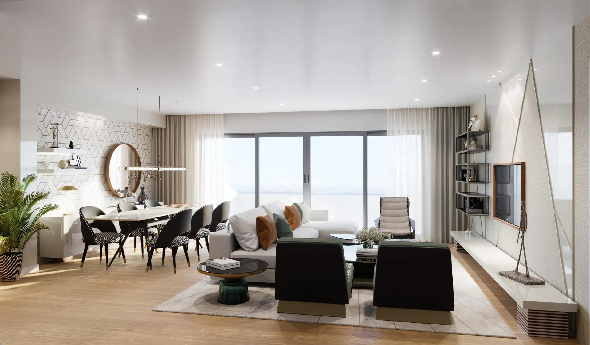 Step inside to discover a modern haven filled with light and elegance. The open-plan design seamlessly connects the living room, dining area, and kitchen, creating a welcoming and spacious environment. Large glass doors invite you to step out onto the terraces and pool area, ensuring a smooth transition between indoor and outdoor living. This thoughtful layout not only maximizes natural light but also enhances the overall experience of living in such a beautiful home.