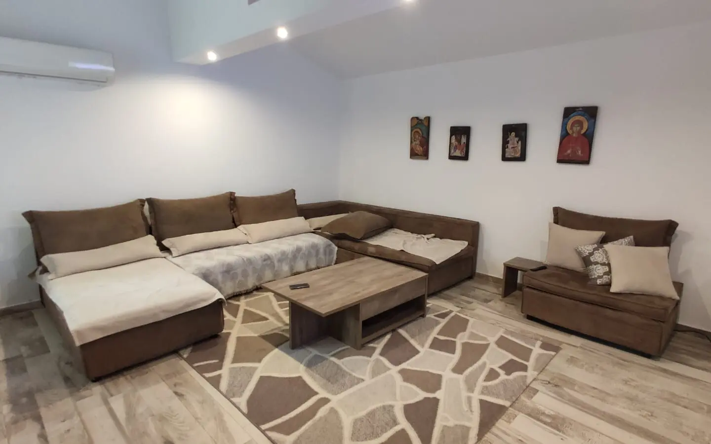 2-storey house of 156 sq.meters on the Olympic Coast. Ground floor consists of 2 bedrooms, living room with kitchen, living room, one shower WC, one gym, one dressing room.